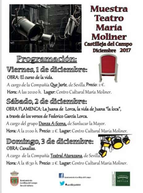 Muestra de Teatro. Programación: Viernes, 1 de Diciembre 2017. Obra: El curso de la Vida A las 20:00h. Centro Cultural Sábado, 2 de Diciembre 2017. SUSPENDIDA POR CAUSAS AJENAS A LA ORGANIZACIÓN. Domingo, 3 de Diciembre 2017. Obra: Canallas. A las 18:30h. Centro CulturalImagen