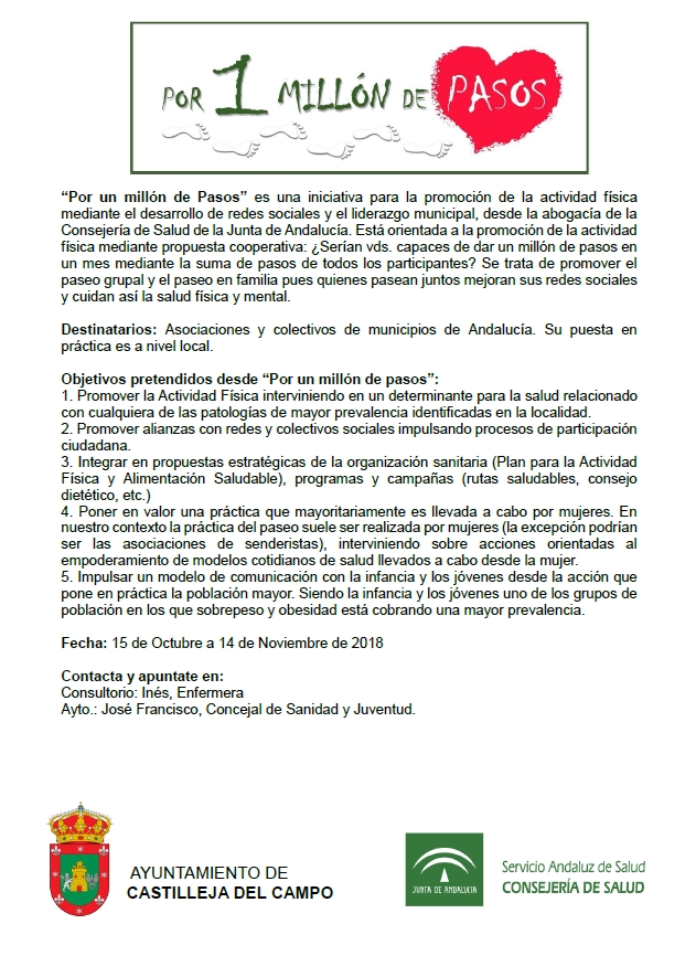 "Por un millón de Pasos" es una iniciativa para la promoción de la actividad física mediante el desarrollo de redes sociales y el liderazgo municipal, desde la abogacía de la Consejería de Salud de la Junta de Andalucía. Está orientada a la promoción de la actividad física mediante propuesta cooperativa: ¿Serían vds. capaces de dar un millón de pasos en un mes mediante la suma de pasos de todos los participantes? Se trata de promover el paseo grupal y el paseo en familia pues quienes pasean juntos mejoran sus redes sociales y cuidan así la salud física y mental.