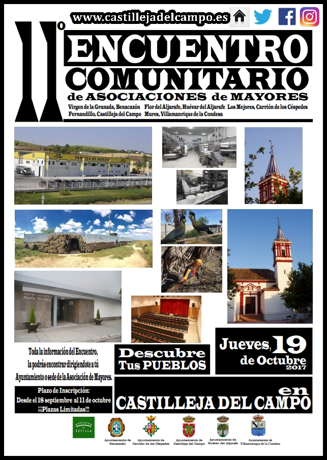 En el XI Encuentro Comunitario de Asocioanes de Mayores, volvemos a reunirnos los municipios vecinos. Como eje central del mismo, la importancia de conocer La Cultura mas cercana bajo el título ``Descubre tus pueblos´´. Información General Fecha del Encuentro: Jueves, 19 de Octubre de 2017. Dirigido: A Socios/As, de las Asocianes de Mayores Participantes. Plazo de Inscripciñon: Del dia 2 al 10 de Octubre. Mas Información, En el Ayuntamiento ( Raul).Imagen