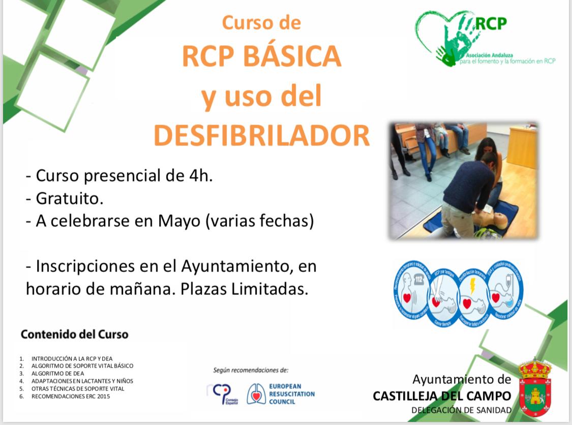 El Ayuntamiento de Castilleja del Campo, a través de la Delegación de Sanidad de este Ayuntamiento y la colaboración desinteresada de un vecin@s por formar a la mayor cantidad de vecino@s de nuestra localidad en esta materia. Con este medida el consistorio pretender conseguir el mayor numero de vecin@s de la localidad que esta en contacto con el publico este formado y sepa actuar. El Ayuntamiento destaca en numero de DESA con el que dispone, uno en la Guardería y otro de reciente colocación en las Pistas Polideportivas, además en breve recibiremos uno para el Coche de la Policía Local. El curso es totalmente Gratuito, con un total de 4 horas presenciales que se pretende realizar en el mes de Mayo, en varias fechas dependiendo de la cantidad de participantes. Mas información en el Ayuntamiento.Imagen