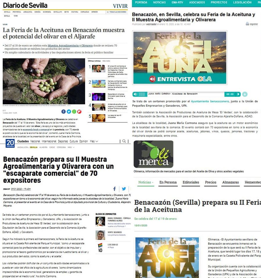 Desde el Ayuntamiento de Benacazón te informamos sobre noticias aparecidas durante estos días en diferentes medios de comunicación que se han hecho eco de nuestra Feria de la Aceituna, II Muestra Agroalimentaria y Olivarera de Benacazón, un macroevento que tendrá lugar los días 17, 18 y 19 de enero de 2020 en la Caseta Polivalente y aledaños del Parque Municipal. Destacamos los titulares como "La Feria de la Aceituna en Benacazón muestra el potencial del olivar en el Aljarafe" y noticias similares publicadas por Diario de Sevilla, La Vanguardia, 20minutos, Europapress, Diputación de Sevilla o Teleprensa, entre otros. Además, la Alcaldesa Juana Mª Carmona ha intervenido en programas de radio "Sevilla, pueblo a pueblo" de Radio Sevilla (Cadena Ser) y en Onda Local Andalucía.