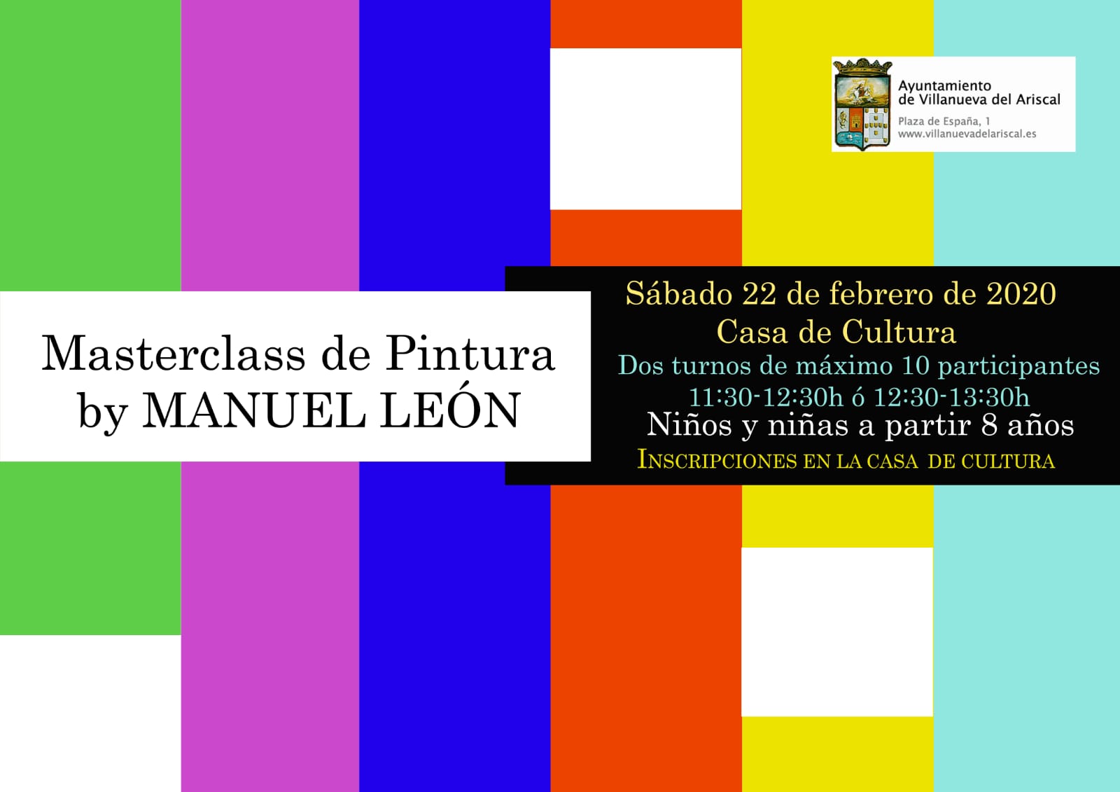Como ya viene siendo tradicional, este año dentro de las V Jornadas Enoturisticas "Taberna, mosto y buena mesa" de Villanueva del Ariscal, nuestro paisano Manuel León, impartirá el día 22 de febrero una Masterclass de Pintura para niños y niñas a partir de 8 años. Tendrá lugar en la Casa de Cultura, en dos turnos de 10 participantes cada uno. Inscríbete !!