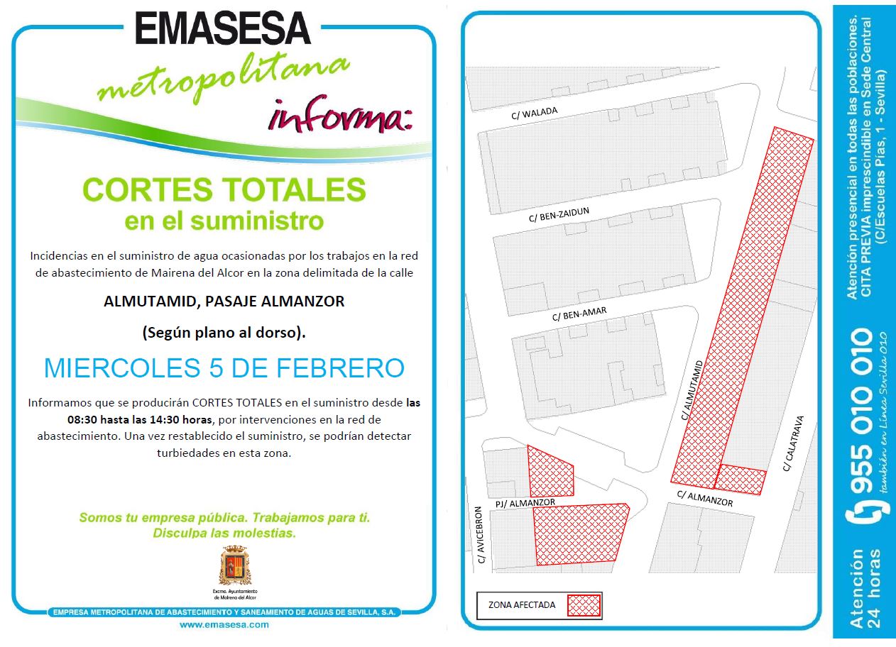 Emasesa Metropolitana informa que el miércoles día 5 de febrero, desde las 8.30 hasta las 14.30 horas, se producirán cortes totales en el suministro de agua. Será en las calles Almutamid y Almanzor.
