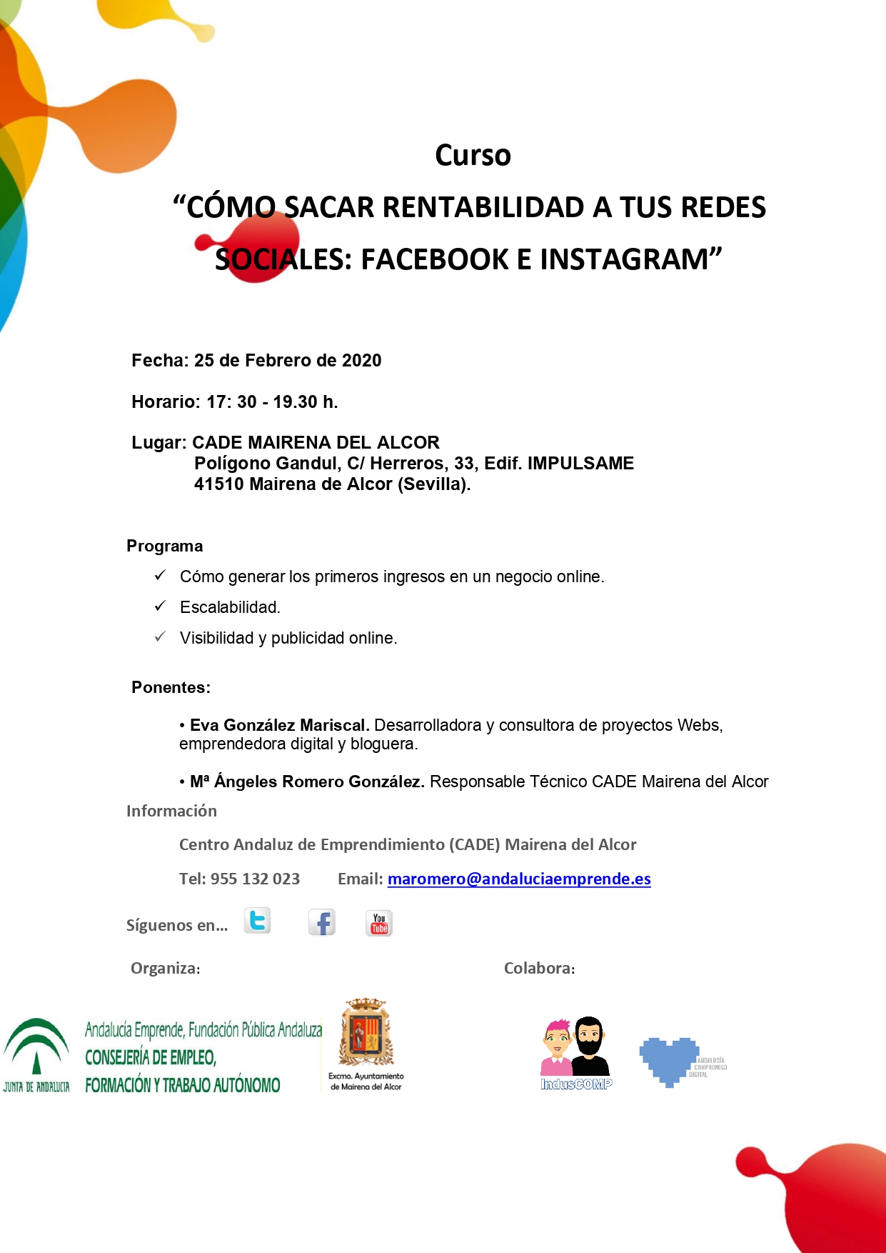 El Centro Andaluz de Emprendimiento (CADE) de Mairena del Alcor en colaboración con el Ayuntamiento de Mairena del Alcor organizan el curso 'Cómo sacar rentabilidad a tus redes sociales: Facebook e Instagram'. Será el martes 25 de febrero de 17.30 a 19.30 horas en el Edificio Impúlsame.
