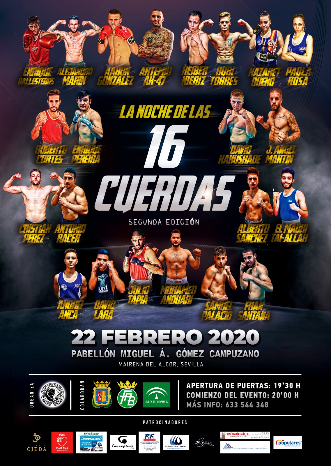 Se trata de un torneo de 8 combates de boxeo olímpico, que contará con la participación de cuatro promesas de este deporte, pertenecientes al club mairenero de boxeo. Entre ellos, la actual Campeona de España Junior, Nazaret Bueno, que además debuta en la Noche de las 16 cuerdas. Paula Rosa en la categoría joven peso minimosca, Andrei Ancai en la categoría joven peso ligero y Julio Tapia en la categoría élite peso pesado.