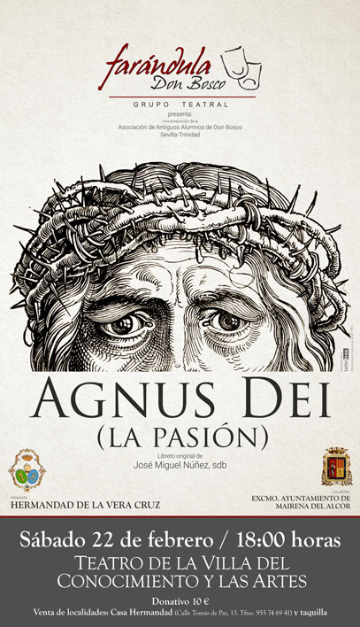 La Hermandad de la Vera Cruz, con la colaboración del Ayuntamiento de Mairena del Alcor, trae al Teatro de la Villa del Conocimiento y las Artes la obra de teatro Agnus Dei (La pasión) del grupo teatral Farándula Don Bosco. Será el sábado día 22 de febrero a las 18.00 horas.