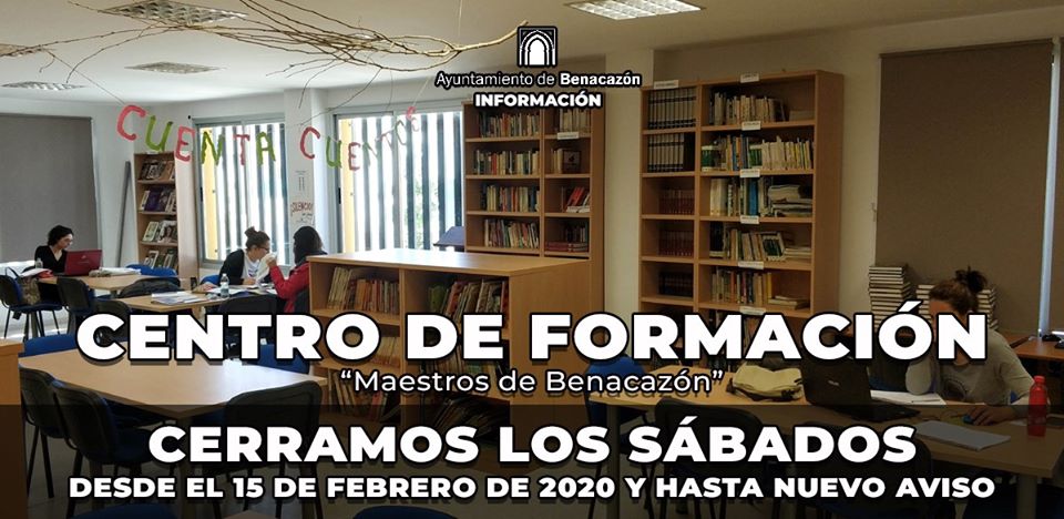 Desde el Ayuntamiento de Benacazón te informamos sobre la disponibilidad de la Sala de Estudios y la Biblioteca Municipal, ubicadas en el Centro de Formación "Maestros de Benacazón", que cierra los sábados hasta nuevo aviso.