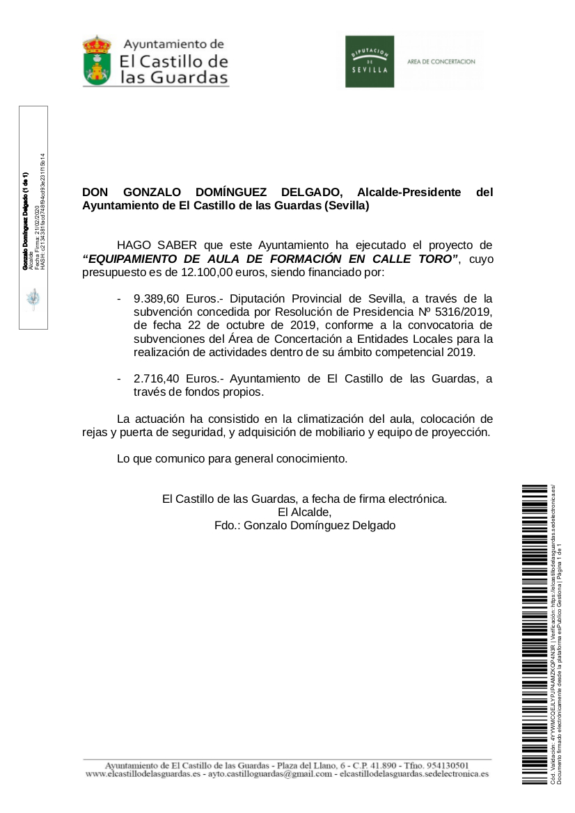 HAGO SABER que este Ayuntamiento ha ejecutado el proyecto de "EQUIPAMIENTO DE AULA DE FORMACIÓN EN CALLE TORO", cuyo presupuesto es de 12.100,00 euros, siendo financiado por: