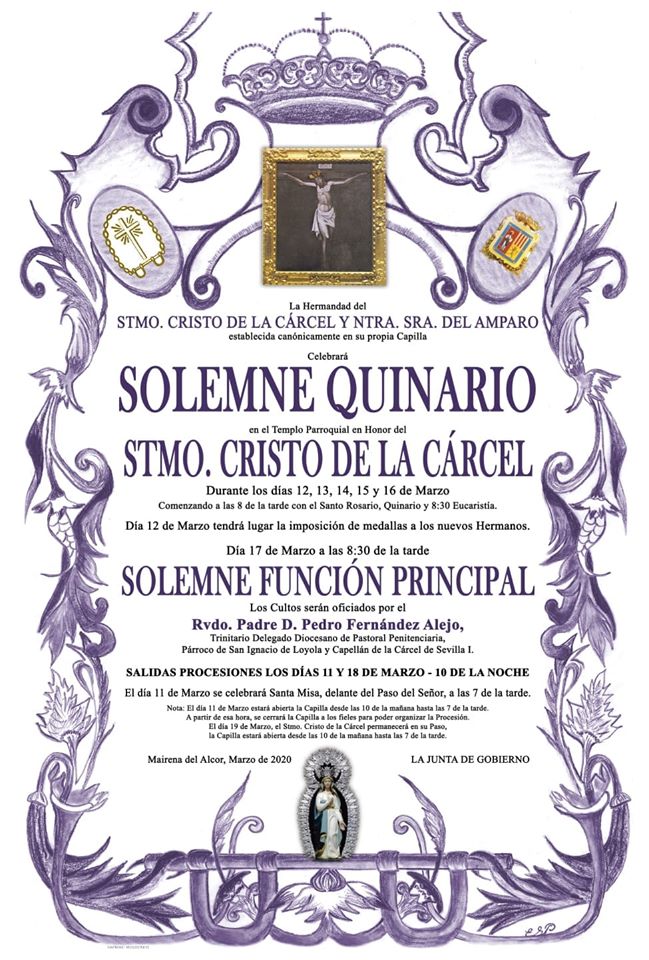 El Solemne Quinario se celebrará del 12 al 16 de marzo. Cada tarde comenzará a las 20.00 horas con el rezo del santo rosario, el quinario y a las 20.30 horas, la eucaristía. El 12 de marzo se impondrá la medalla a los nuevos hermanos.