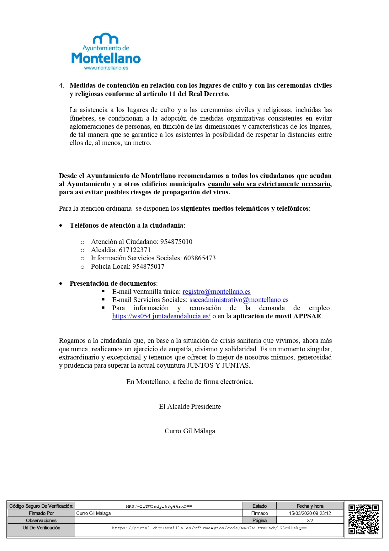 En base al Real Decreto por el que se ha declarado el Estado de Alarma para la situación de crisis sanitaria originada por el Coronavirus, desde el Ayuntamiento de Montellano queremos informar de algunas medias importantes que tenemos que tener en cuenta.