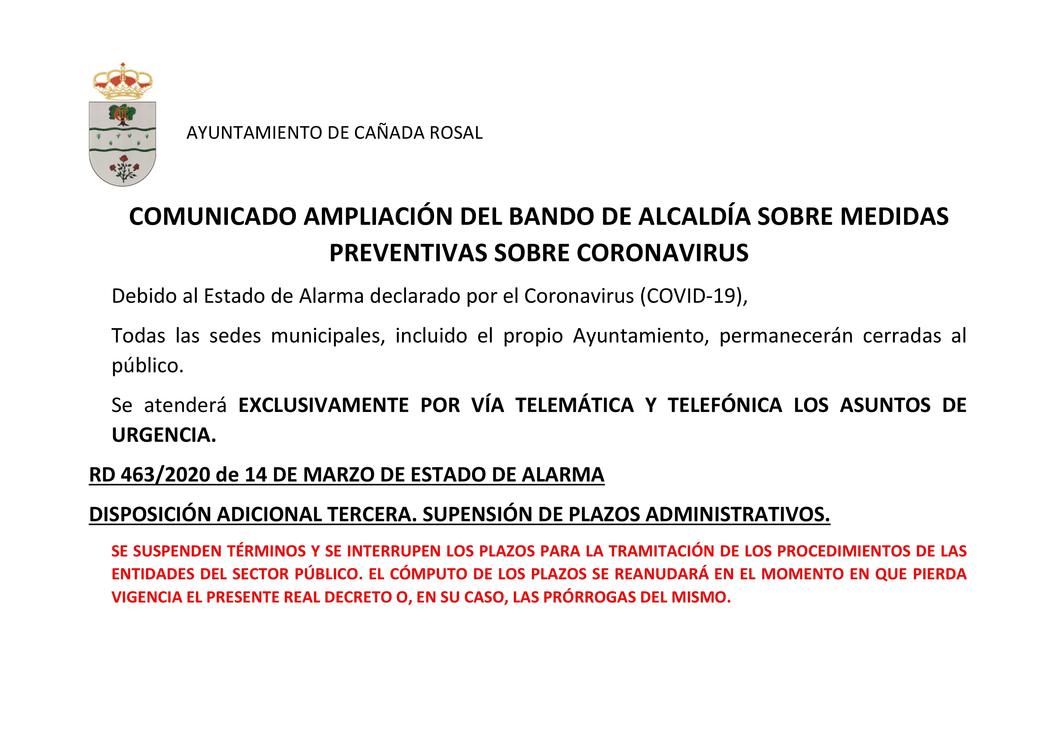 COMUNICADO AMPLIACIÓN DEL BANDO DE ALCALDÍA SOBRE MEDIDAS PREVENTIVAS SOBRE CORONAVIRUS