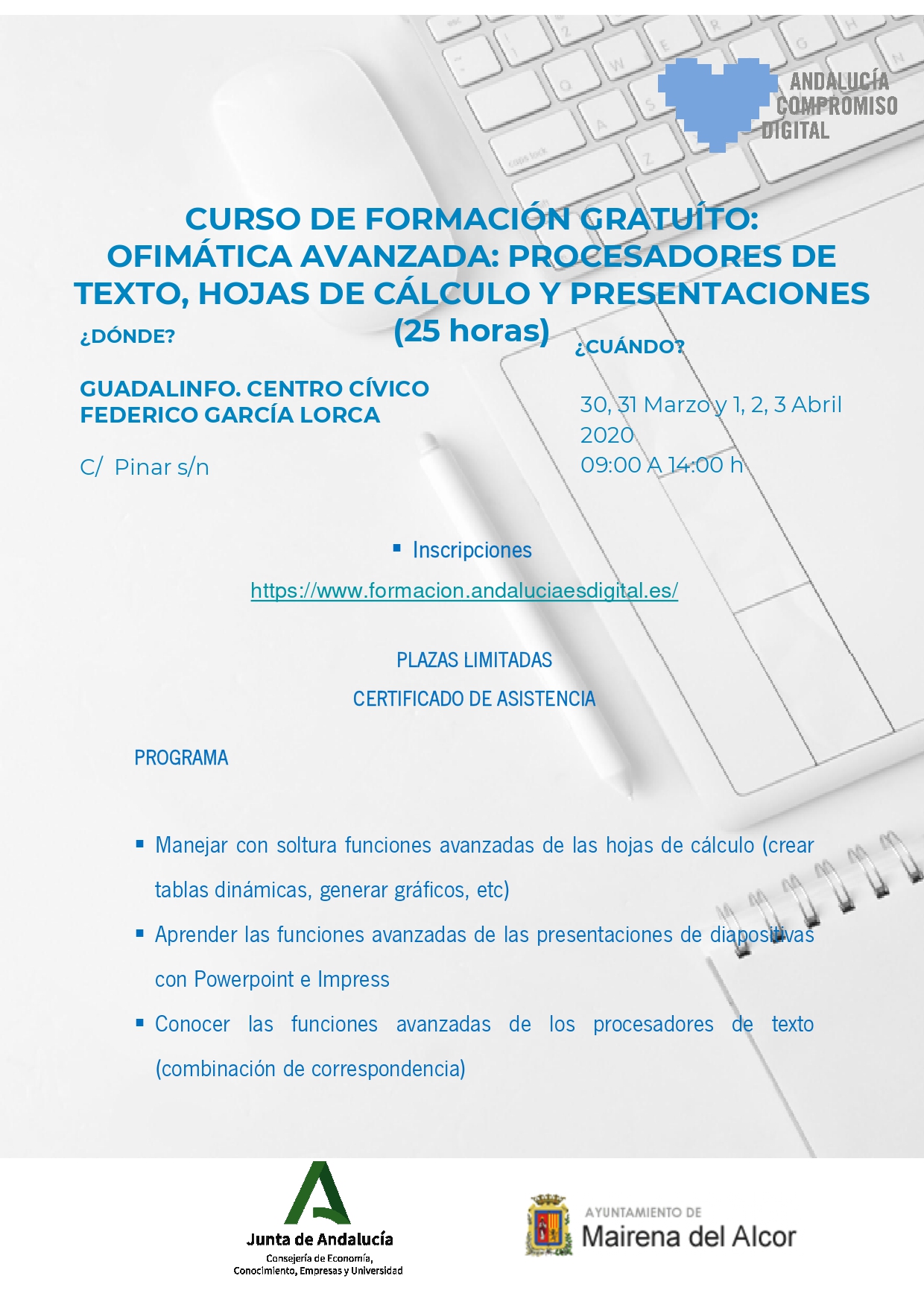 Se pospone hasta nuevo aviso, el curso gratuito 'Ofimática avanzada: procesadores de texto, hojas de cálculo y presentaciones' que Andalucía Compromiso Digital iba a impartir del 30 de marzo al 3 de abril en el Centro Guadalinfo - Centro Cívico Federico García Lorca. En las próximas semanas anunciaremos la nueva fecha.