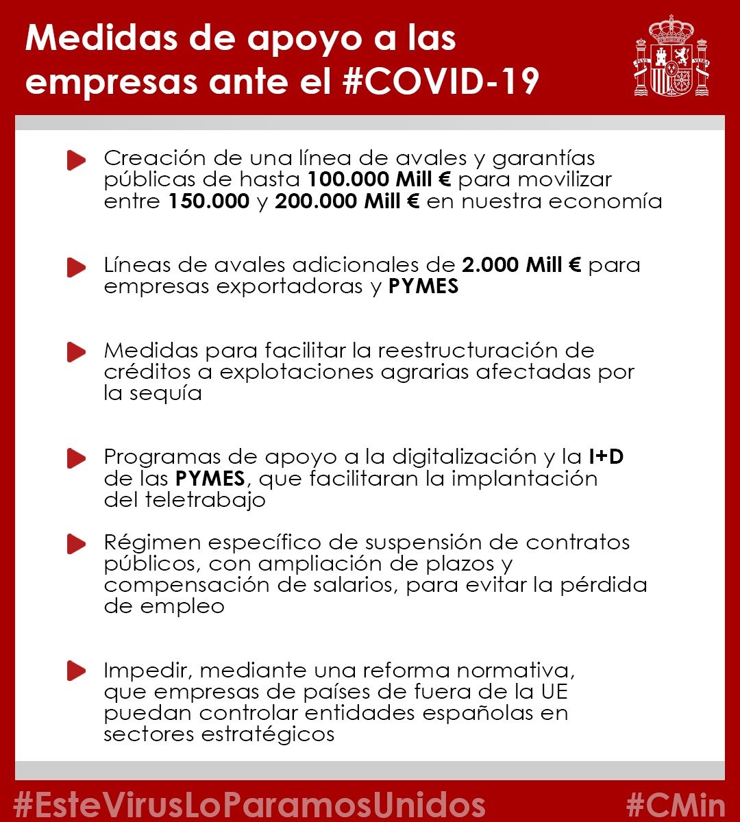 Asimismo, se han acordado avales adicionales de 2.000 millones de euros para empresas exportadoras, se facilitará la restructuración de créditos a explotaciones agrarias afectadas por la sequía y se acelerará la implantación de programas de apoyo a la digitalización. Las Administraciones Públicas ayudarán a sus empresas contratistas para mitigar las consecuencias del COVID-19 en los contratos del sector público. El Ejecutivo también ha reformado la normativa sobre inversiones exteriores para impedir que empresas de países de fuera de la Unión Europea puedan hacerse con el control de entidades españolas en sectores estratégicos, aprovechando la caída coyuntural del valor de sus acciones.