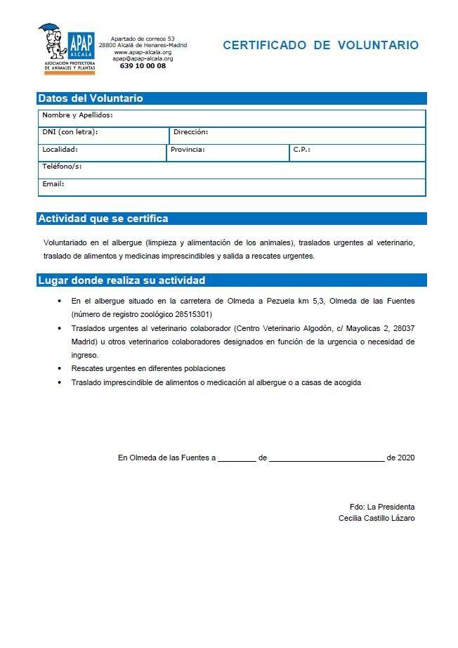 Adjuntamos igualmente un ejemplo/modelo de salvoconducto o autorización para las personas que hagan tareas de voluntariado en los centros de protección animal de cara a facilitar a las fuerzas de seguridad la identificación de estas personas.