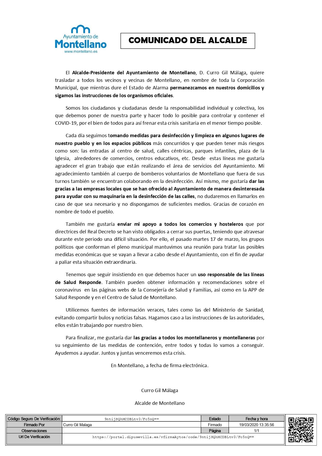 El Alcalde-Presidente del Ayuntamiento de Montellano, D. Curro Gil Málaga, quiere trasladar a todos los vecinos y vecinas de Montellano, en nombre de toda la Corporación Municipal, que mientras dure el Estado de Alarma permanezcamos en nuestros domicilios y sigamos las instrucciones de los organismos oficiales.
