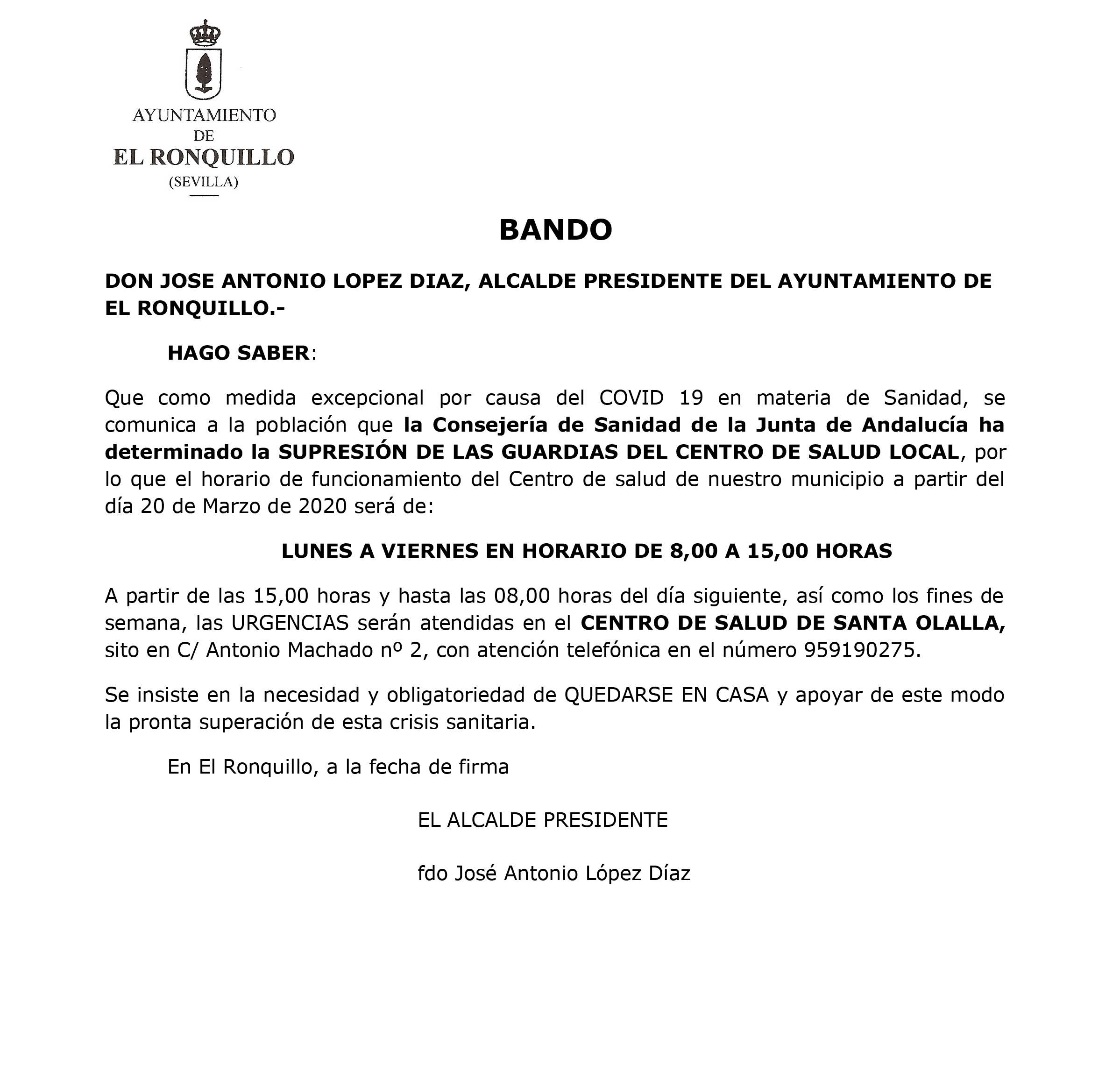 DON JOSE ANTONIO LÓPEZ DÍAZ, ALCALDE PRESIDENTE DEL AYUNTAMIENTO DE EL RONQUILLO.-