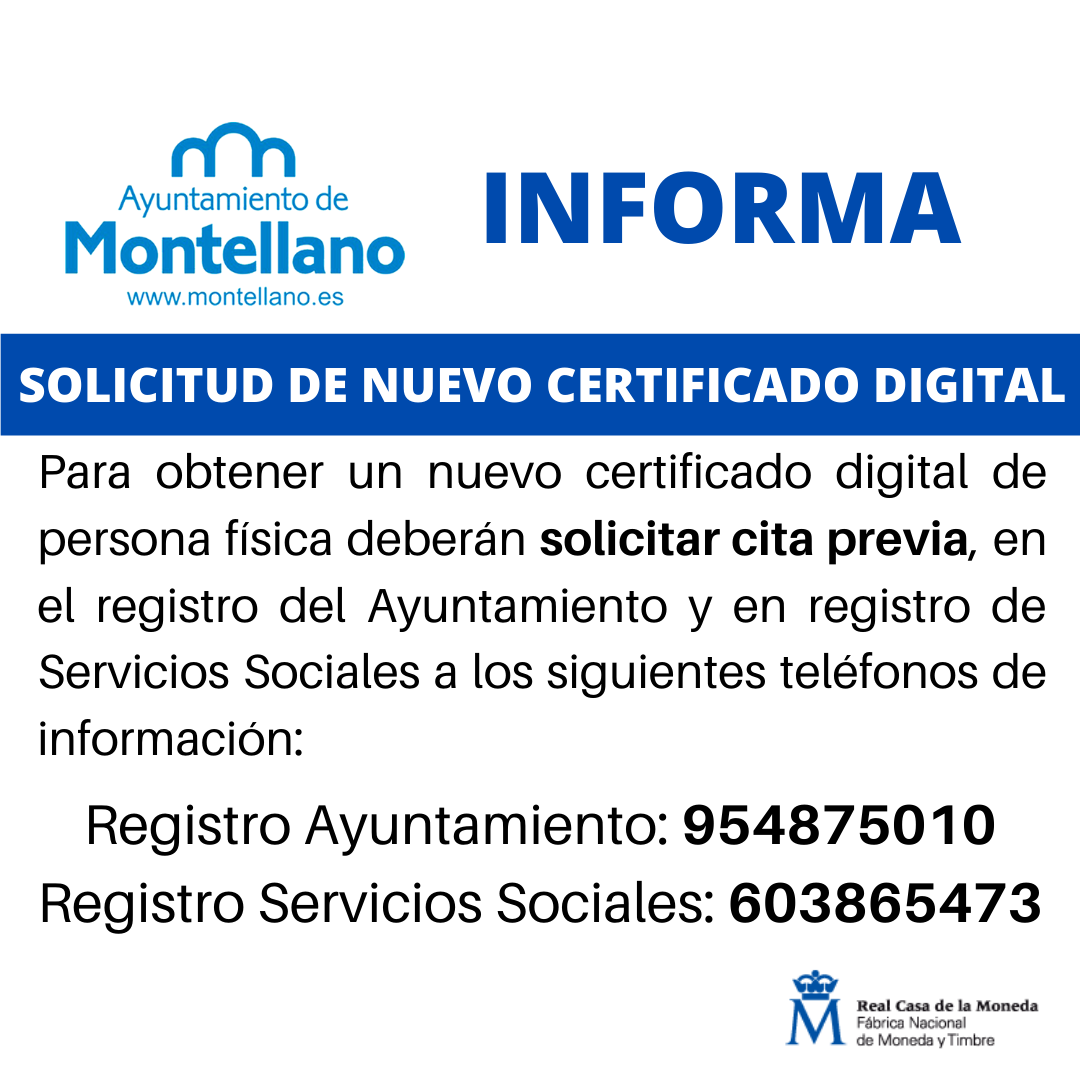 Para obtener un nuevo certificado digital de persona física deberán pedir cita previa a los teléfonos que de adjuntan en la imagen del registro del Ayuntamiento (Conchi Mendoza) y en el registro de Servicios Sociales (Loli Lara).