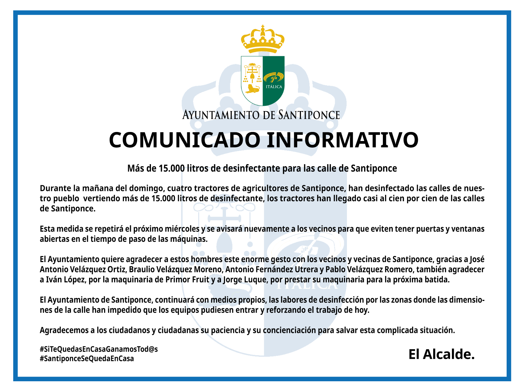 El Ayuntamiento quiere agradecer a estos hombres este enorme gesto con los vecinos y vecinas de Santiponce, gracias a José Antonio Velázquez Ortiz, Braulio Velázquez Moreno, Antonio Fernández Utrera y Pablo Velázquez Romero, también agradecer a Iván López, por la maquinaria de Primor Fruit y a Jorge Luque, por prestar su maquinaria para la próxima batida.