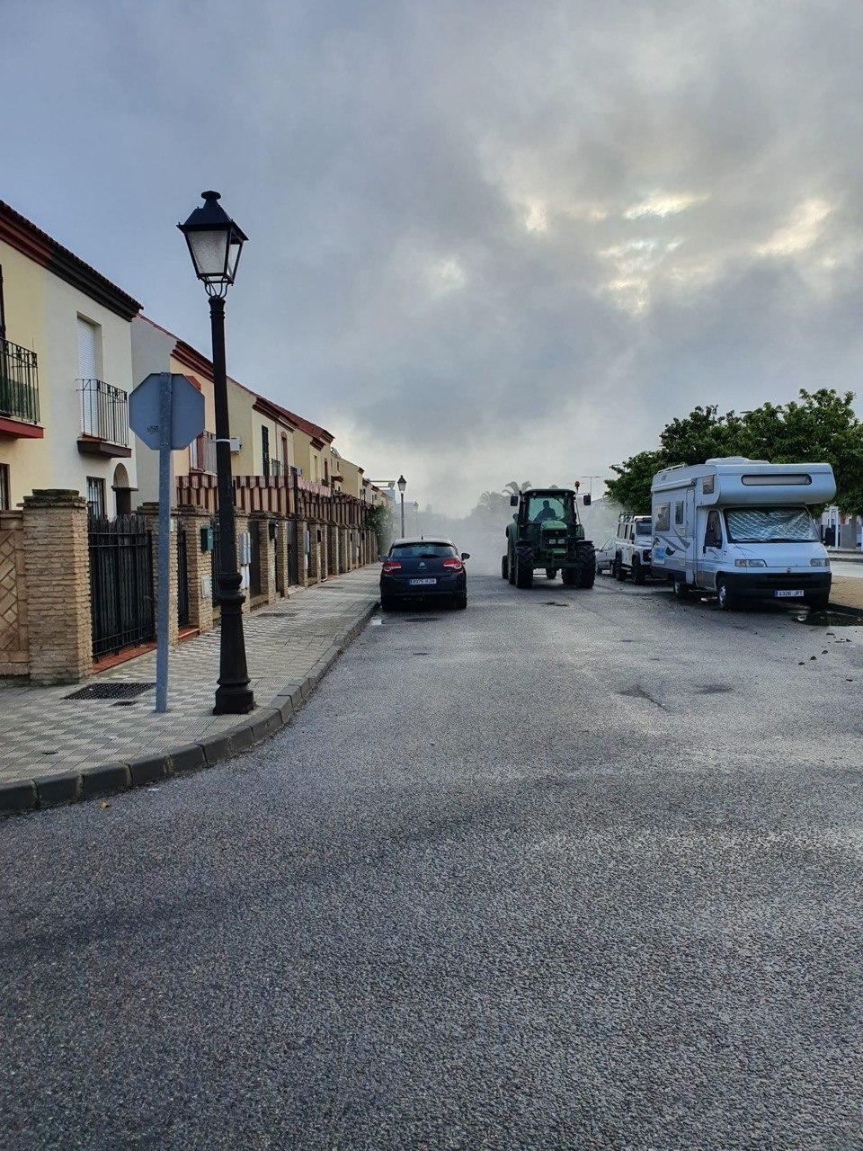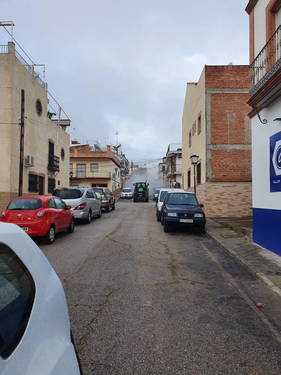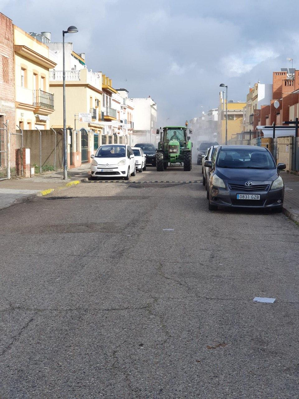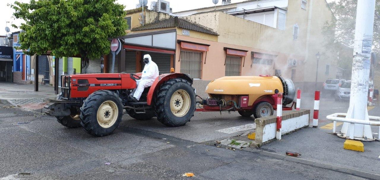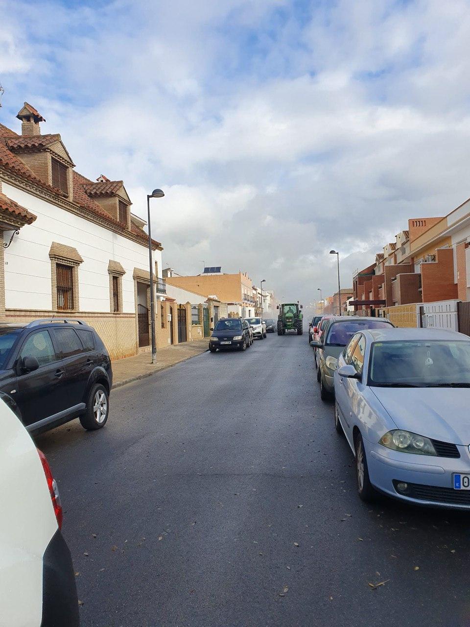 Durante la mañana del domingo, cuatro tractores de agricultores de Santiponce, han desinfectado las calles de nuestro pueblo vertiendo más de 15.000 litros de desinfectante, los tractores han llegado casi al cien por cien de las calles de Santiponce.