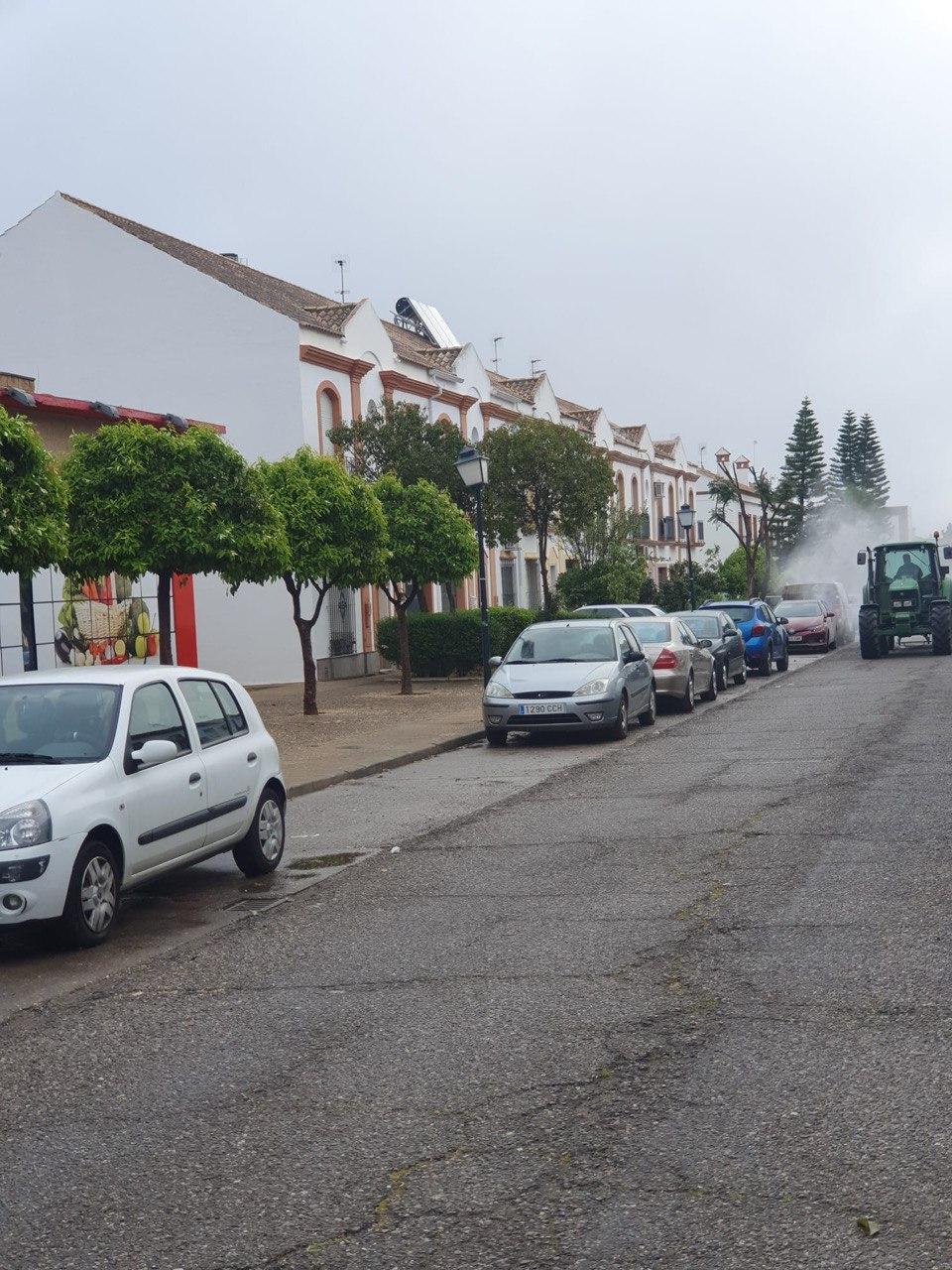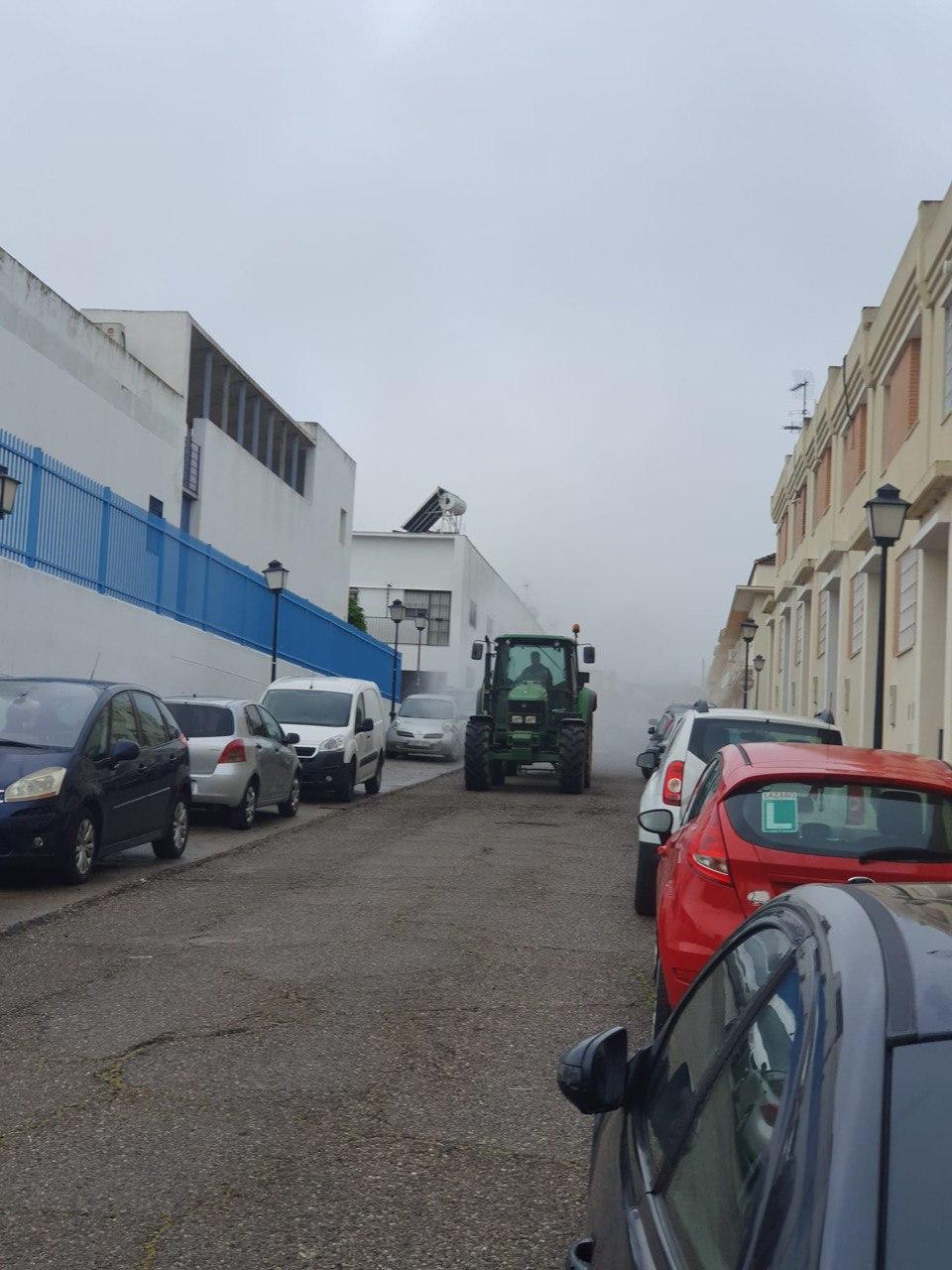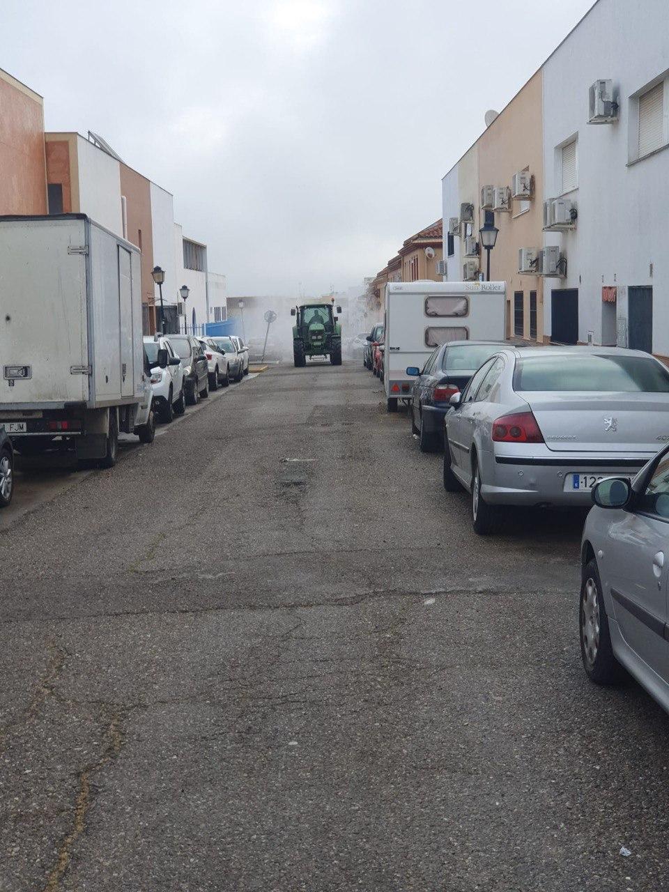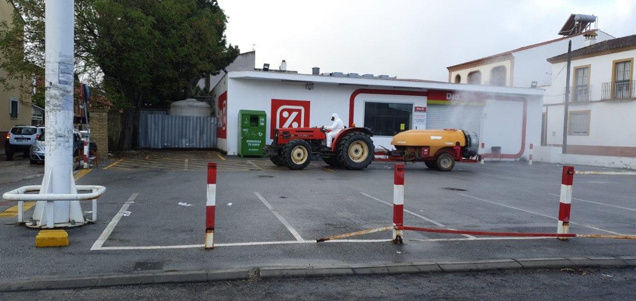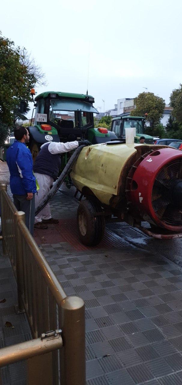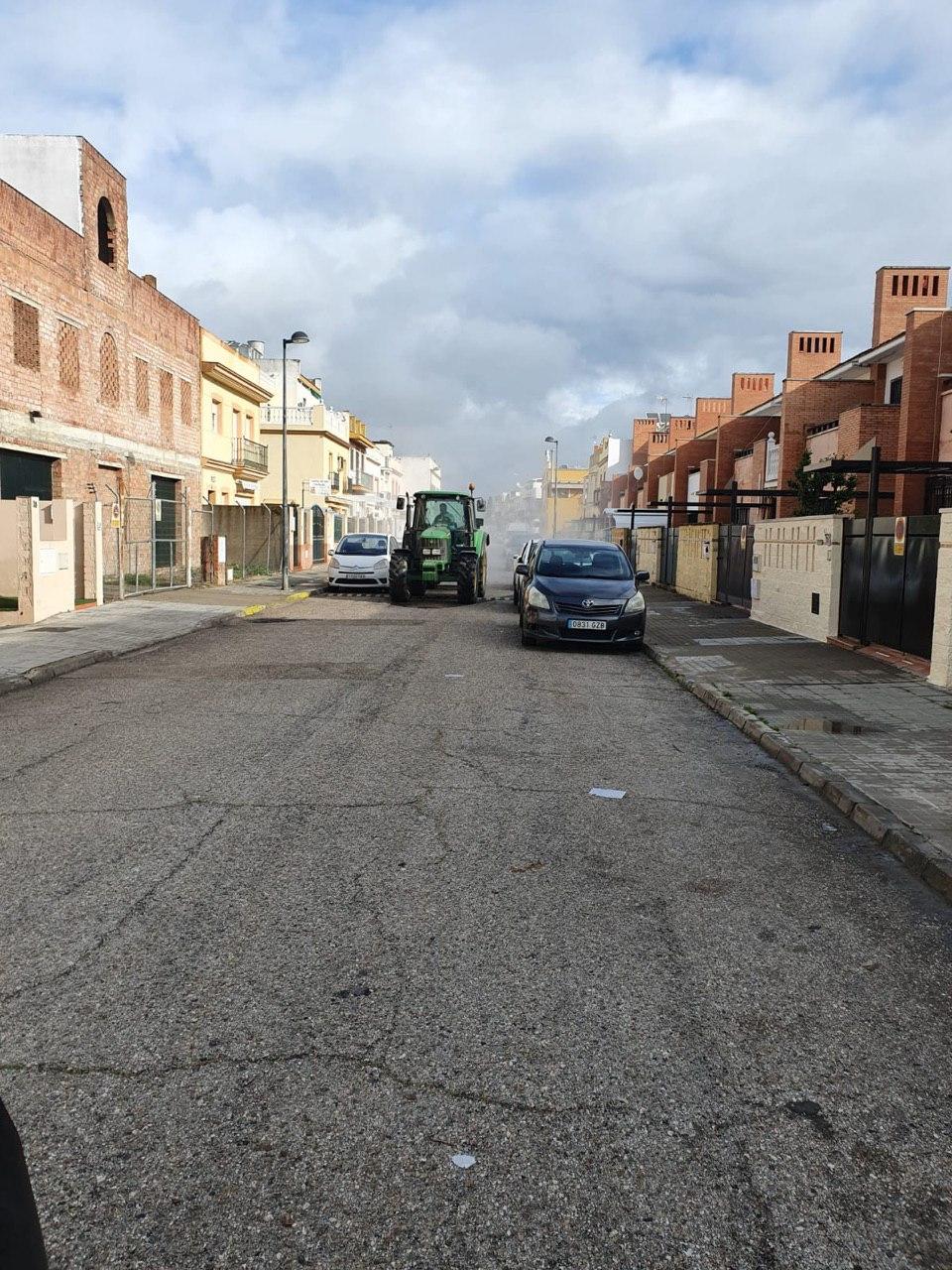 Durante la mañana del domingo, cuatro tractores de agricultores de Santiponce, han desinfectado las calles de nuestro pueblo vertiendo más de 15.000 litros de desinfectante, los tractores han llegado casi al cien por cien de las calles de Santiponce.