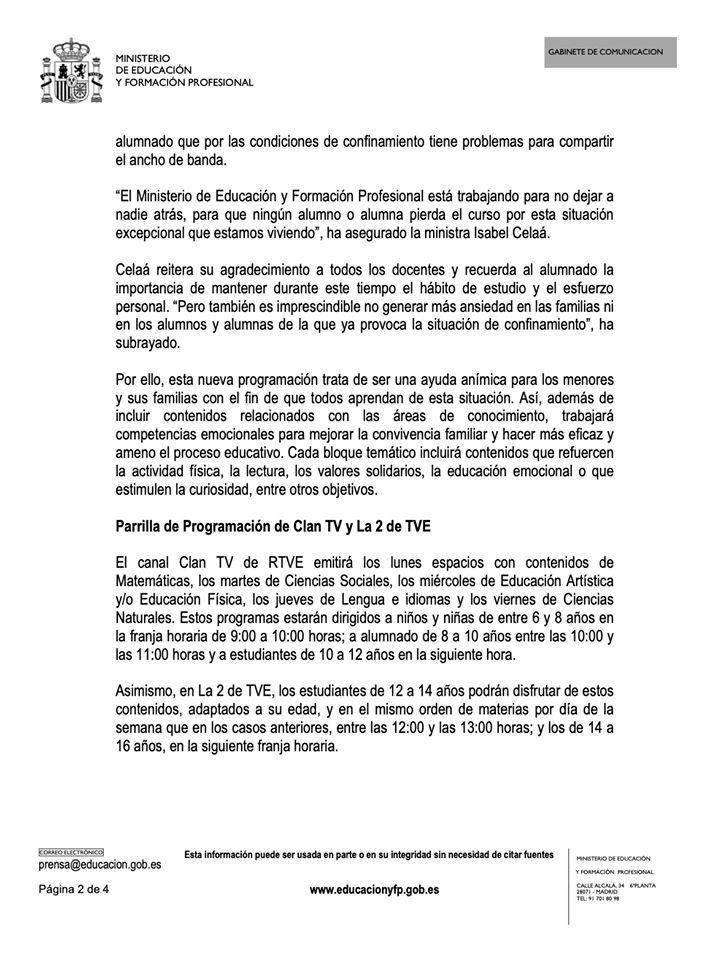 Se trata de una programación especial de cinco horas diarias de contenidos educativos que se emitirá en abierto durante las mañanas, de lunes a viernes, en Clan TV y en La 2 de TVE.