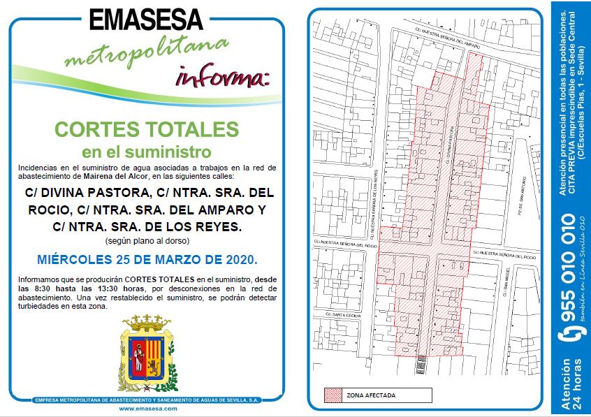 Emasesa Metropolitana informa que el miércoles día 25 de marzo desde las 8.30 hasta las 13.30 horas, se producirán cortes totales en el suministro de agua en las calles Divina Pastora, Ntra. Sra. del Rocío, Ntra. Sra. del Amparo y Ntra. Sra. de los Reyes.
