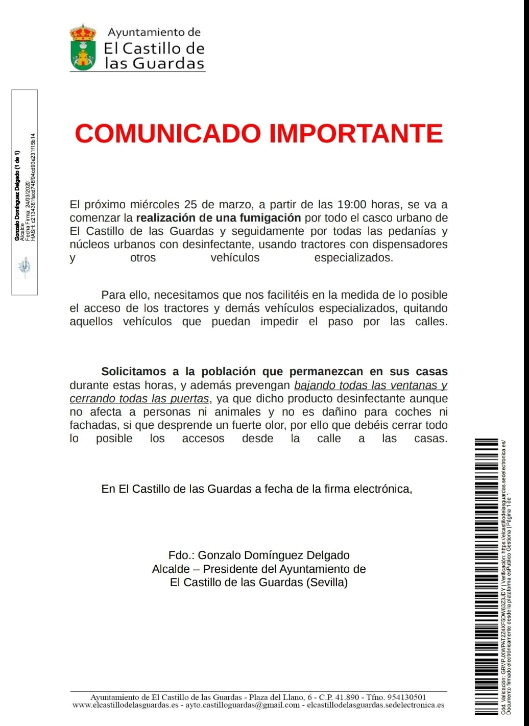 Mañana miércoles 25 de marzo, a partir de las 19:00 horas, se va a comenzar la realización de una fumigación por el casco urbano de El Castillo de las Guardas y seguidamente por todas las pedanías y núcleos urbanos con desinfectante, usando tractores con dispensadores y otros vehículos especializados.