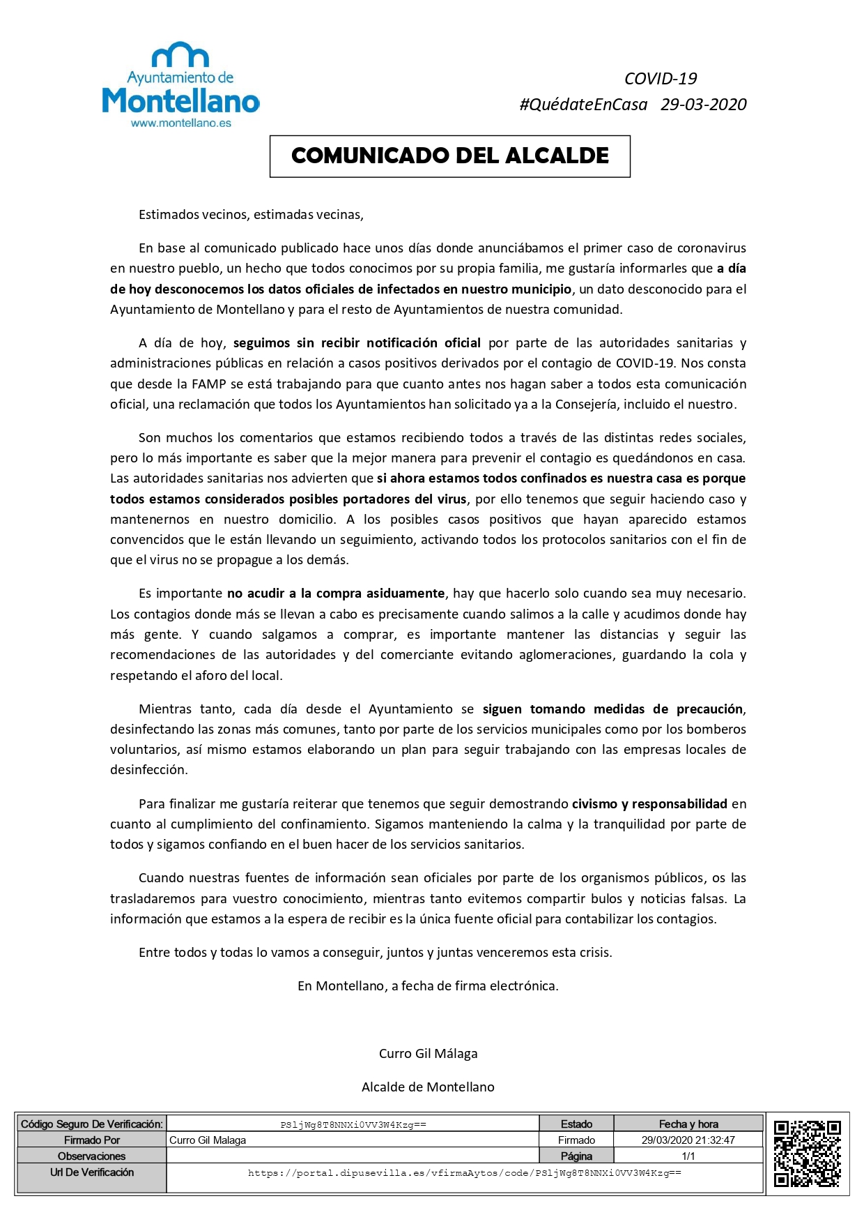 En base al comunicado publicado hace unos días donde anunciábamos el primer caso de coronavirus en nuestro pueblo, un hecho que todos conocimos por su propia familia, me gustaría informarles que a día de hoy desconocemos los datos oficiales de infectados en nuestro municipio, un dato desconocido para el Ayuntamiento de Montellano y para el resto de Ayuntamientos de nuestra comunidad.