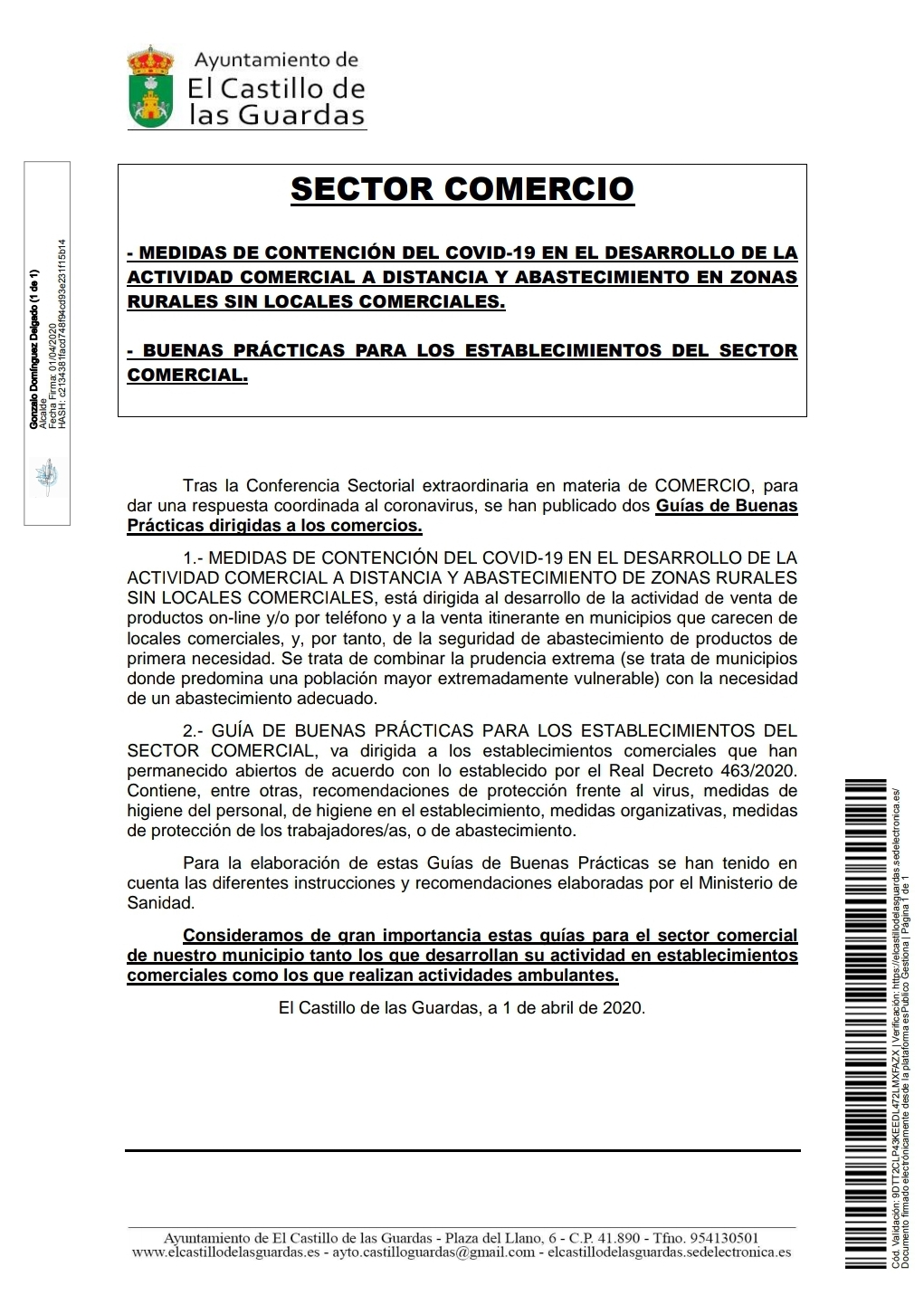 Tras la Conferencia Sectorial extraordinaria en materia de Comercio junto con las pautas marcadas por Ministerio de Industria, Comercio y Turismo, se han publicado unas Guías de buenas prácticas dirigidas al control del Coronavirus en establecimientos del sector comercial y actividades ambulantes de gran importancia en estos momentos para nuestro municipio de El Castillo de las Guardas y sus Aldeas.