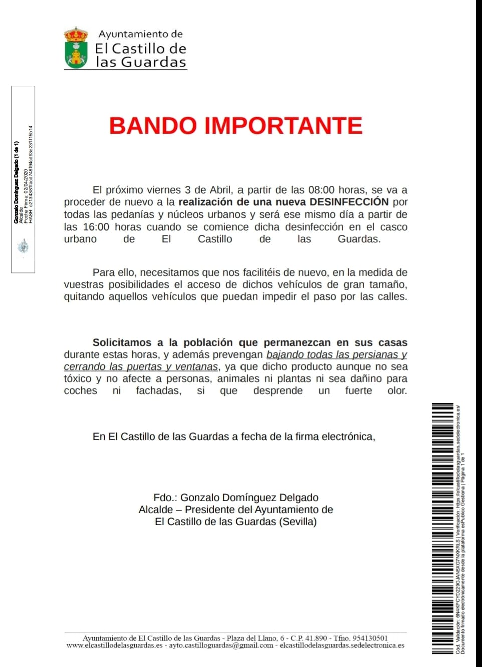 El próximo Viernes 03 de Abril, a partir de las 08:00 horas, se comenzará de nuevo con la DESINFECCIÓN de todas las aldeas y núcleos diseminados de El Castillo de las Guardas, y ese mismo día a partir de las 16 h. se procederá a realizarlo por el casco urbano de El Castillo de las Guardas.