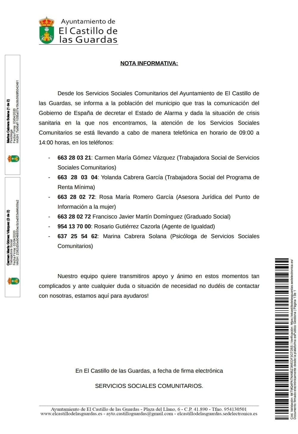 El área de Servicios Sociales, atención social primaria e igualdad del Ayto. de El Castillo de las Guardas informan: