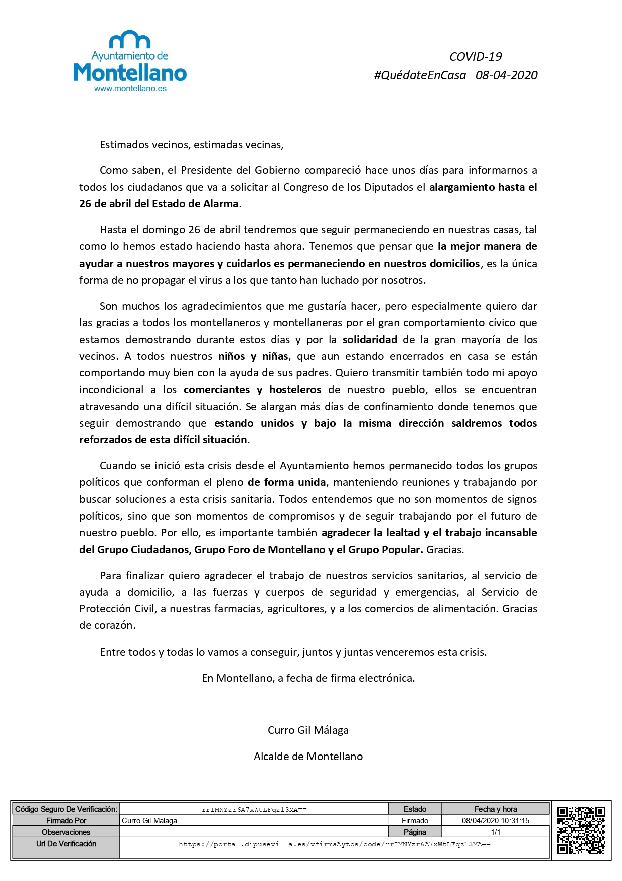 Cuando se inició esta crisis desde el Ayuntamiento hemos permanecido todos los grupos políticos que conforman el pleno de forma unida, manteniendo reuniones y trabajando por buscar soluciones a esta crisis sanitaria. Todos entendemos que no son momentos de signos políticos, sino que son momentos de compromisos y de seguir trabajando por el futuro de nuestro pueblo. Por ello, es importante también agradecer la lealtad y el trabajo incansable del Grupo Ciudadanos, Grupo Foro de Montellano y el Grupo Popular. Gracias.