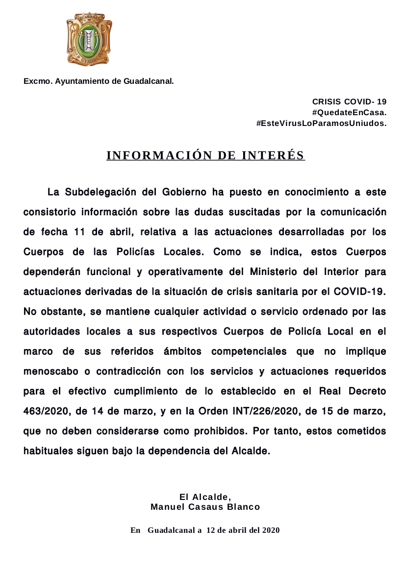 Imagen Ubicación Categoría noticia Alcaldia Mostrar en el carrusel de la sección No Fecha Dom, 12/04/2020 - 19:44 Más información http://www.guadalcanal.es/es/actualidad/noticias/INFORMACION-DE-INTERES-00049/