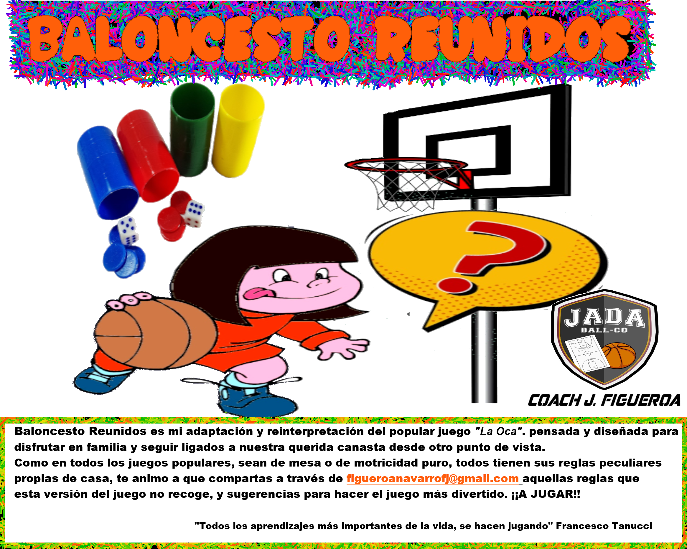 Baloncesto reunidos es la adaptación y reinterpretación del tradicional juego de la oca, pensada y diseñada para disfrutar en familia y seguir fomentando la afición al baloncesto durante el confinamiento, desde otro punto de vista. La Delegación de Deportes difunde esta iniciativa del monitor de las Escuelas Deportivas Municipales de Baloncesto Francisco Javier Figueroa.