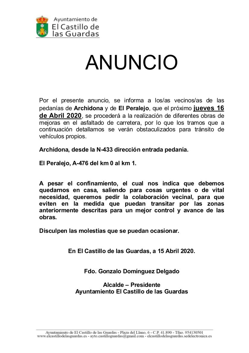 Por el presente anuncio, se informa a los/as vecinos/as de las pedanías de Archidona y de El Peralejo, que el próximo jueves 16 de Abril 2020, se procederá a la realización de diferentes obras de mejoras en el asfaltado de carretera, por lo que los tramos que a continuación detallamos se verán obstaculizados para tránsito de vehículos propios.