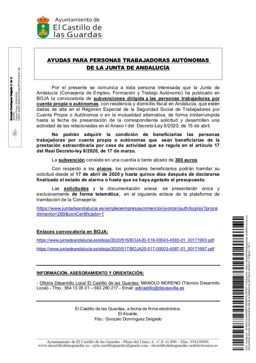 Por el presente anuncio queremos comunicar a toda persona interesada que la Junta de Andalucía (Consejería de Empleo, Formación y Trabajo Autónomo) ha publicado en BOJA la convocatoria de subvenciones dirigida a las personas trabajadoras por cuenta propia o autónomas, con residencia y domicilio fiscal en Andalucía, que estén dadas de alta en el Régimen Especial de la Seguridad Social de Trabajadores por Cuenta Propia o Autónomos o en la mutualidad alternativa, de forma ininterrumpida hasta la fecha de presentación de la correspondiente solicitud y desarrollen una actividad de las relacionadas en el Anexo I del Decreto-Ley 9/2020, de 15 de abril.