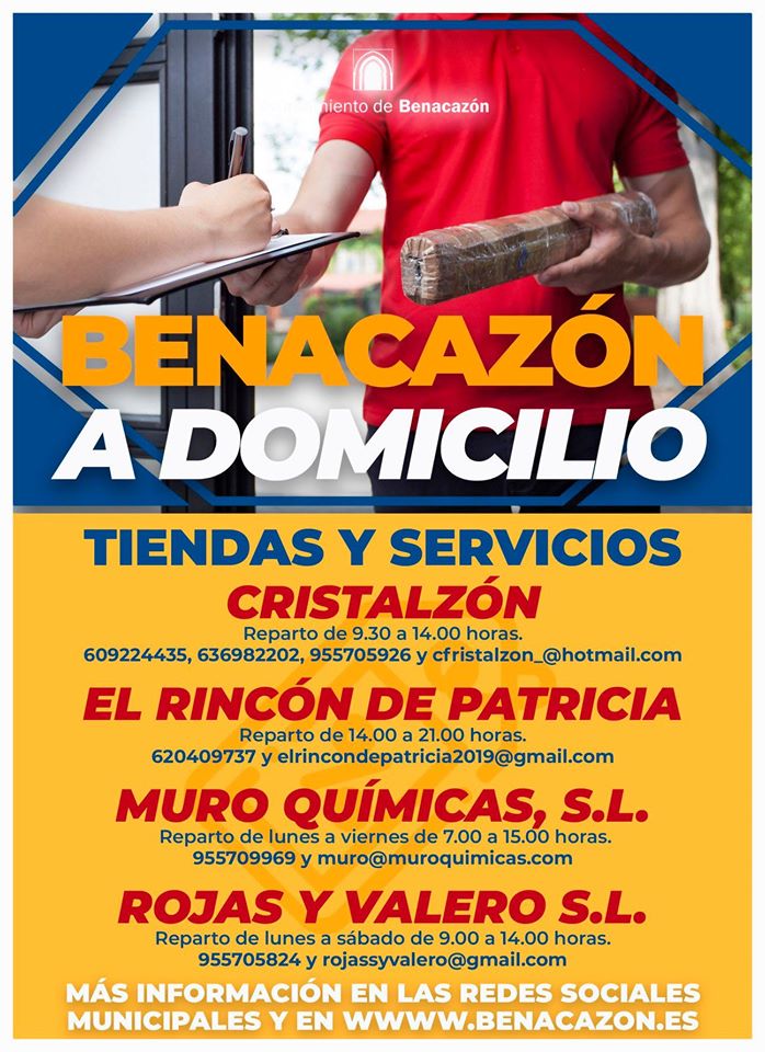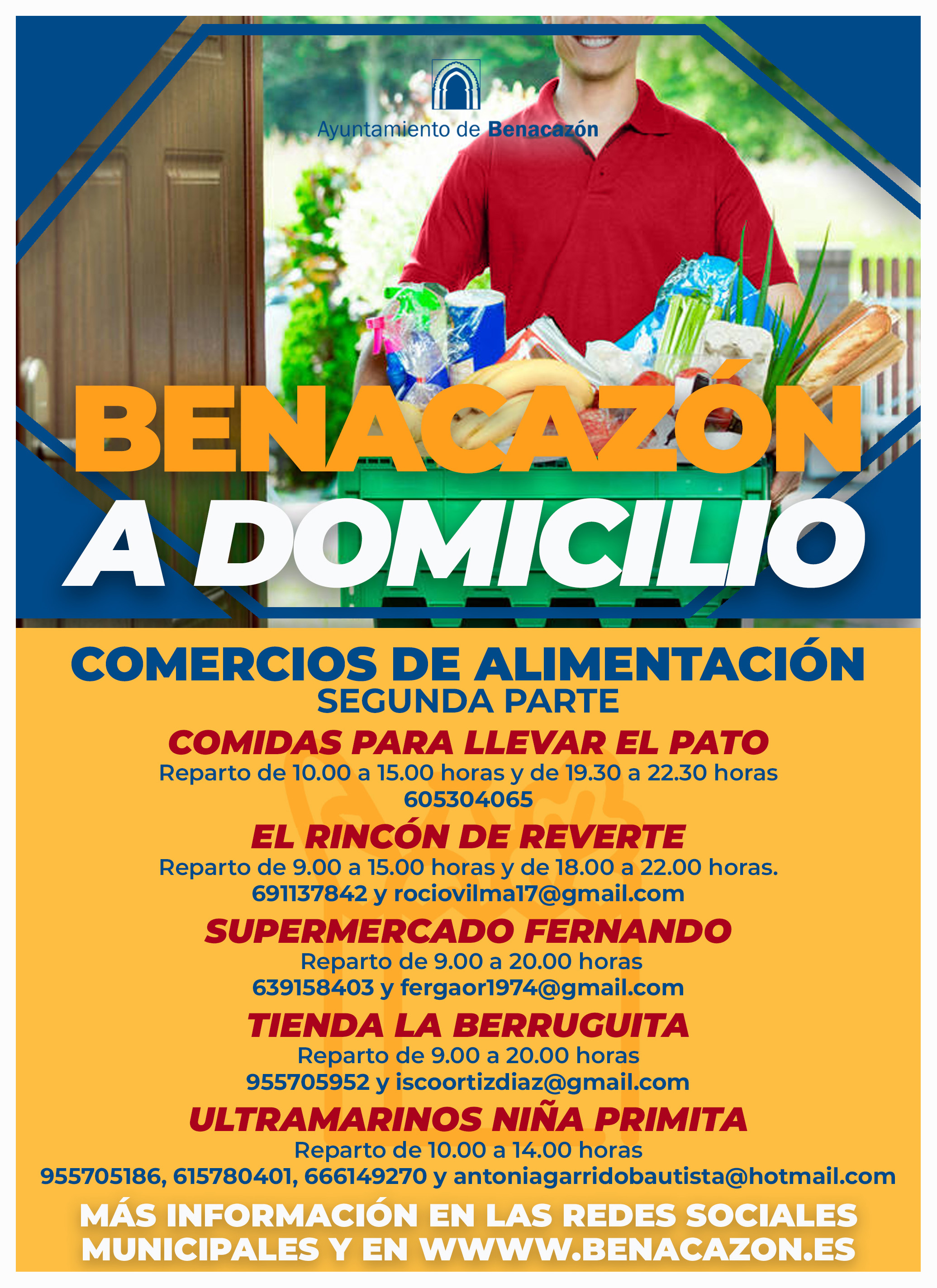 Desde el Ayuntamiento de Benacazón te mostramos la primera parte de nuestra nueva campaña "Benacazón a Domicilio", una iniciativa del Área municipal de Desarrollo Local que quiere facilitar las compras de proximidad durante este periodo de confinamiento derivado de la crisis sanitaria de la Covid-19. Con esta acción, el Ayuntamiento quiere dar visibilidad a las empresas locales que se dedican al comercio y la restauración con servicio a domicilio y, de este modo, disminuir en lo posible los efectos negativos de la crisis económica que se prevé.