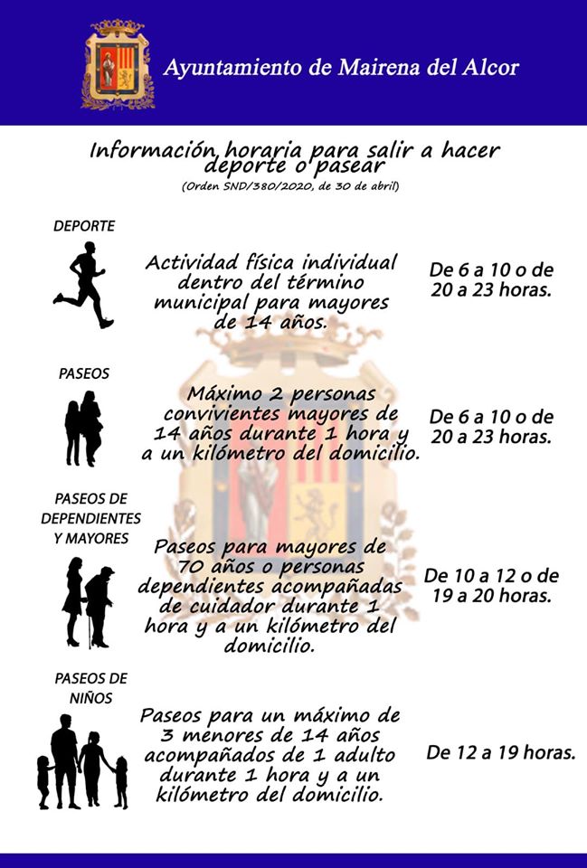 La práctica de deporte individual y los paseos solo podrán llevarse a cabo entre las 6.00 horas y las 10.00 horas y entre las 20.00 horas y las 23.00 horas. Las personas mayores de 70 de años podrán practicar deporte individual y pasear entre las 10:00 horas y las 12:00 horas y entre las 19:00 horas y las 20:00 horas.