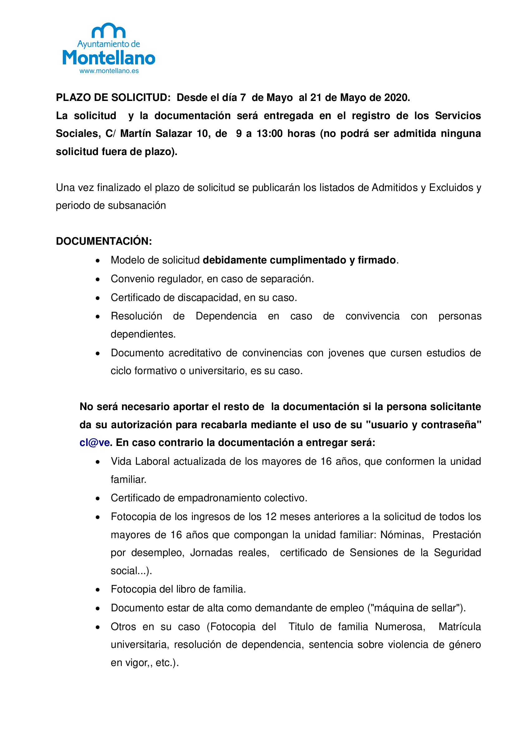 La solicitud y la documentación será entregada en el registro de los Servicios Sociales, C/ Martín Salazar 10, de 9 a 13:00 horas (no podrá ser admitida ninguna solicitud fuera de plazo).
