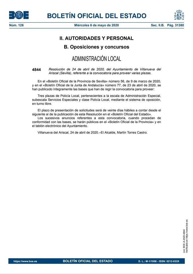 En el BOE de hoy ha salido publicada el anuncio de la Provisión de 3 Plazas de la Policia Local de nuestro pueblo. Las bases se encuentran publicadas en el tablón electronico de la sede electrónica.