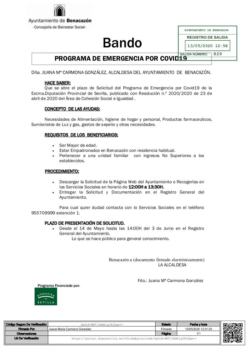 Desde el Ayuntamiento de Benacazón te informamos que se abre el plazo de solicitud del "Programa de Emergencia por Covid-19" de la Diputación de Sevilla, publicado con resolución nº 2020/2020 de 23 de abril de 2020 del Área de Cohesión Social e Igualdad.