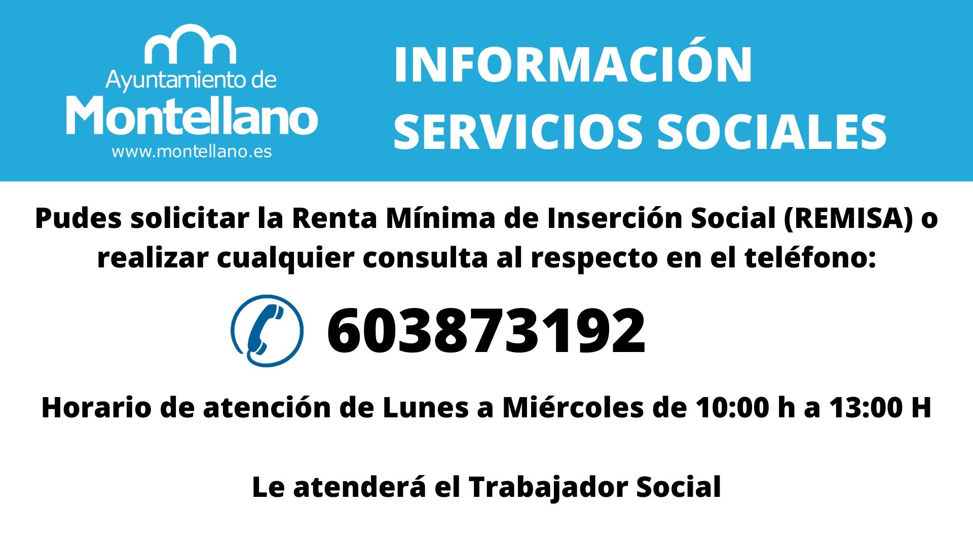 #REMISA Se informa a todas aquellas personas que deseen solicitar la Renta Mínima de Inserción Social (REMISA) o bien realizar cualquier consulta al respecto, podrá hacerlo a través del teléfono 603873192 donde le atenderá el Trabajador Social.