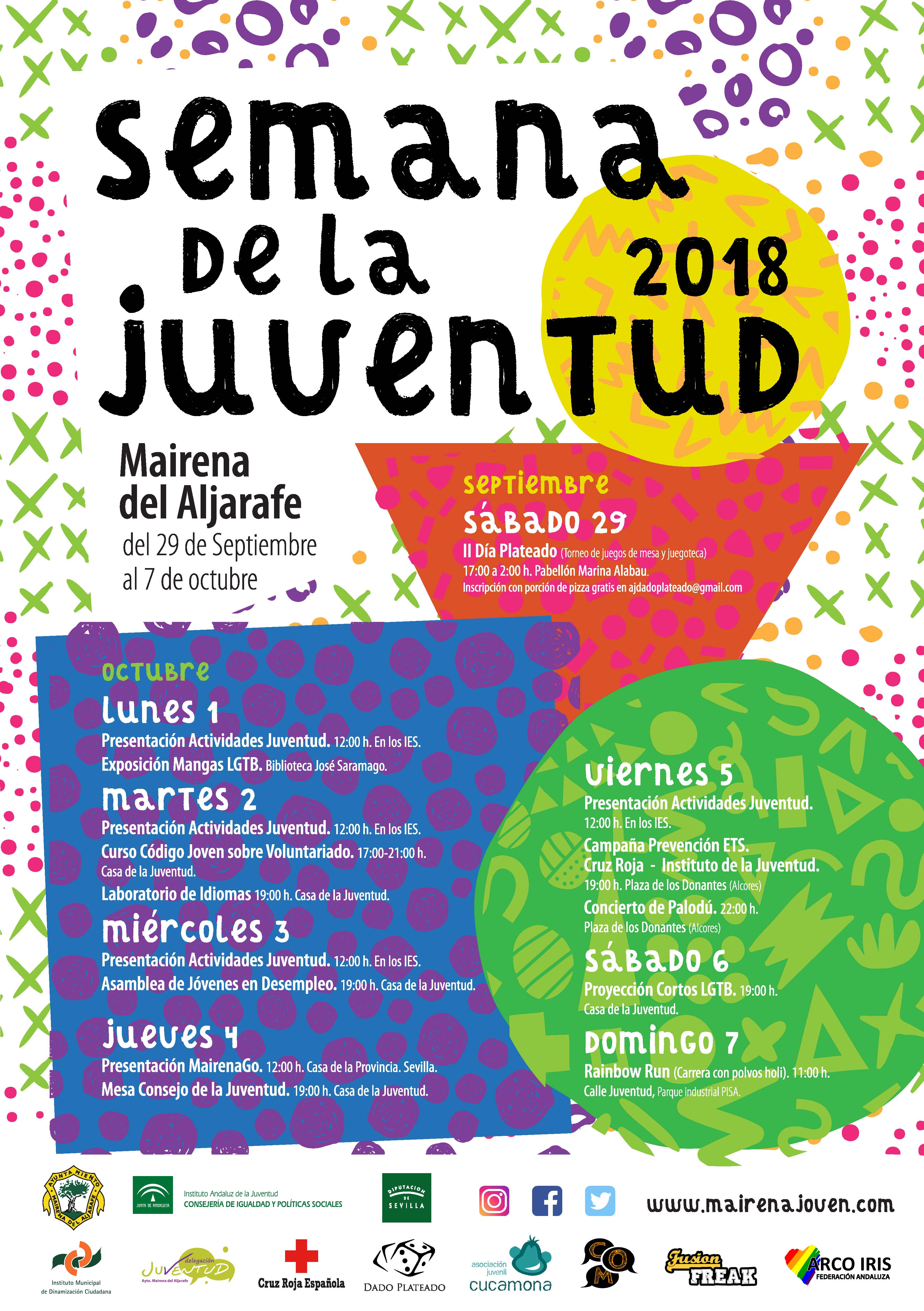 Fecha inicio Lun, 01/10/2018 - 09:00 Fecha fin Dom, 07/10/2018 - 14:00 Imágenes Ubicación Categoría evento Juventud Mostrar en el carrusel de la sección No Más información http://www.mairenadelaljarafe.es/es/actualidad/eventos/Semana-de-la-Juventud/