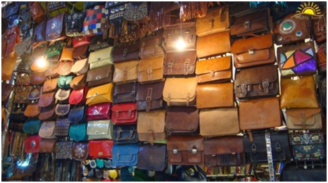 - Artesanía en cuero: carteras, bolsos, artículos de escritorio, zapatos, maletas…podemos encontrar una amplia variedad de productos realizados en diferentes tipos de cuero y colores. Destacan las de Marrakech y Tánger.