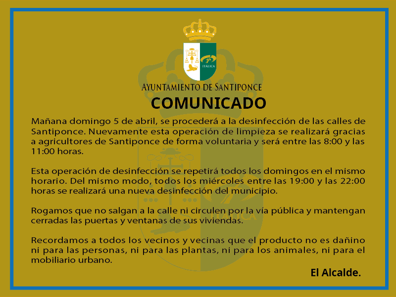 Recordemos que mañana domingo 5 de abril, se procederá a la desinfección de las calles de Santiponce. Nuevamente esta operación de limpieza se realizará gracias a agricultores de Santiponce de forma voluntaria y será entre las 8:00 y las 11:00 horas