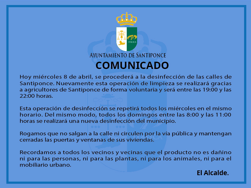 Recordemos que hoy miércoles 8 de abril, se procederá a la desinfección de las calles de Santiponce. Nuevamente esta operación de limpieza se realizará gracias a agricultores de Santiponce de forma voluntaria y será entre las 19:00 y las 22:00 horas