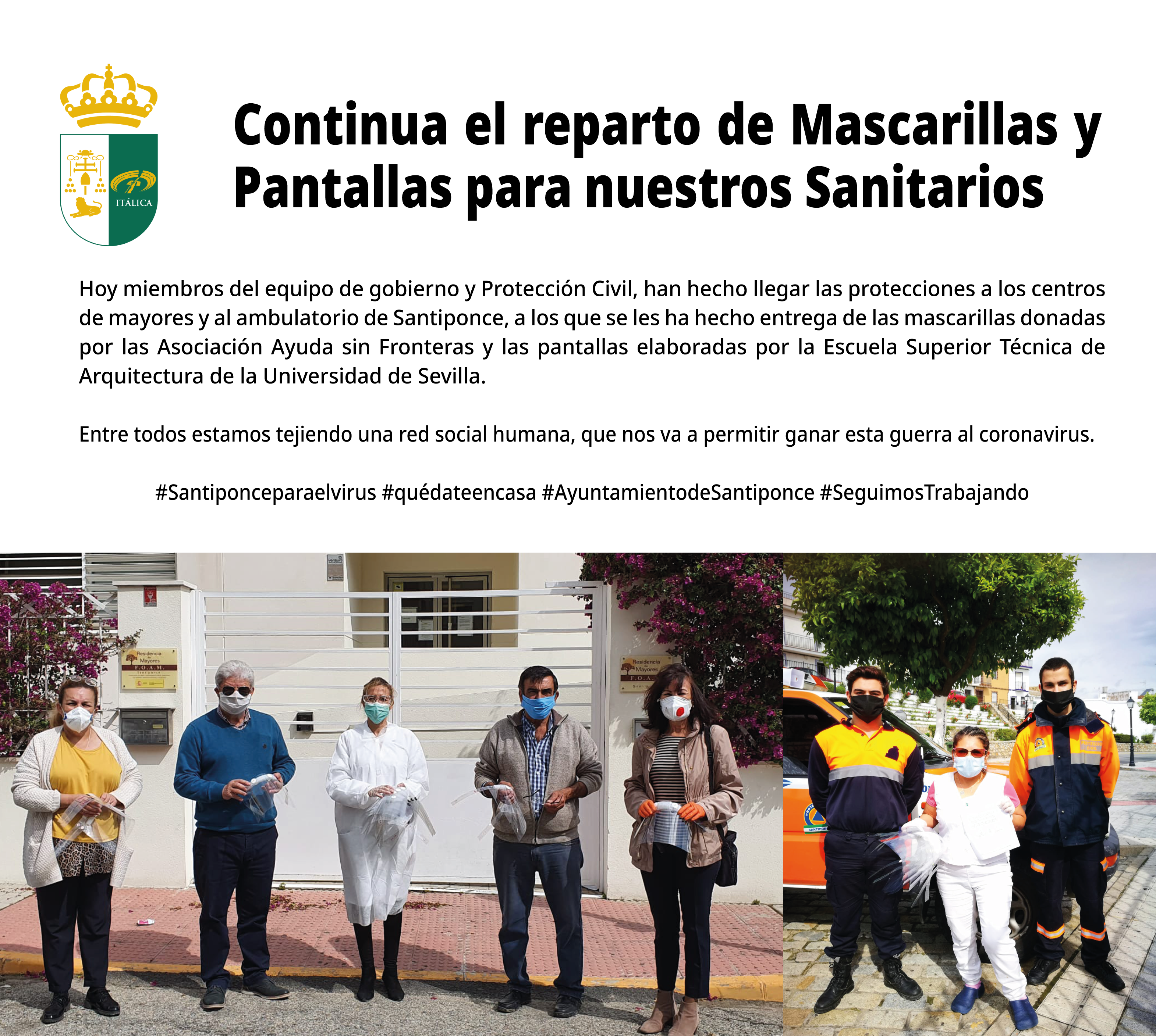 Hoy miembros del equipo de gobierno y Protección Civil, han hecho llegar las protecciones a los centros de mayores y al ambulatorio de Santiponce, a los que se les ha hecho entrega de las mascarillas donadas por las Asociación Ayuda sin Fronteras y las pantallas elaboradas por la Escuela Superior Técnica de Arquitectura de la Universidad de Sevilla.