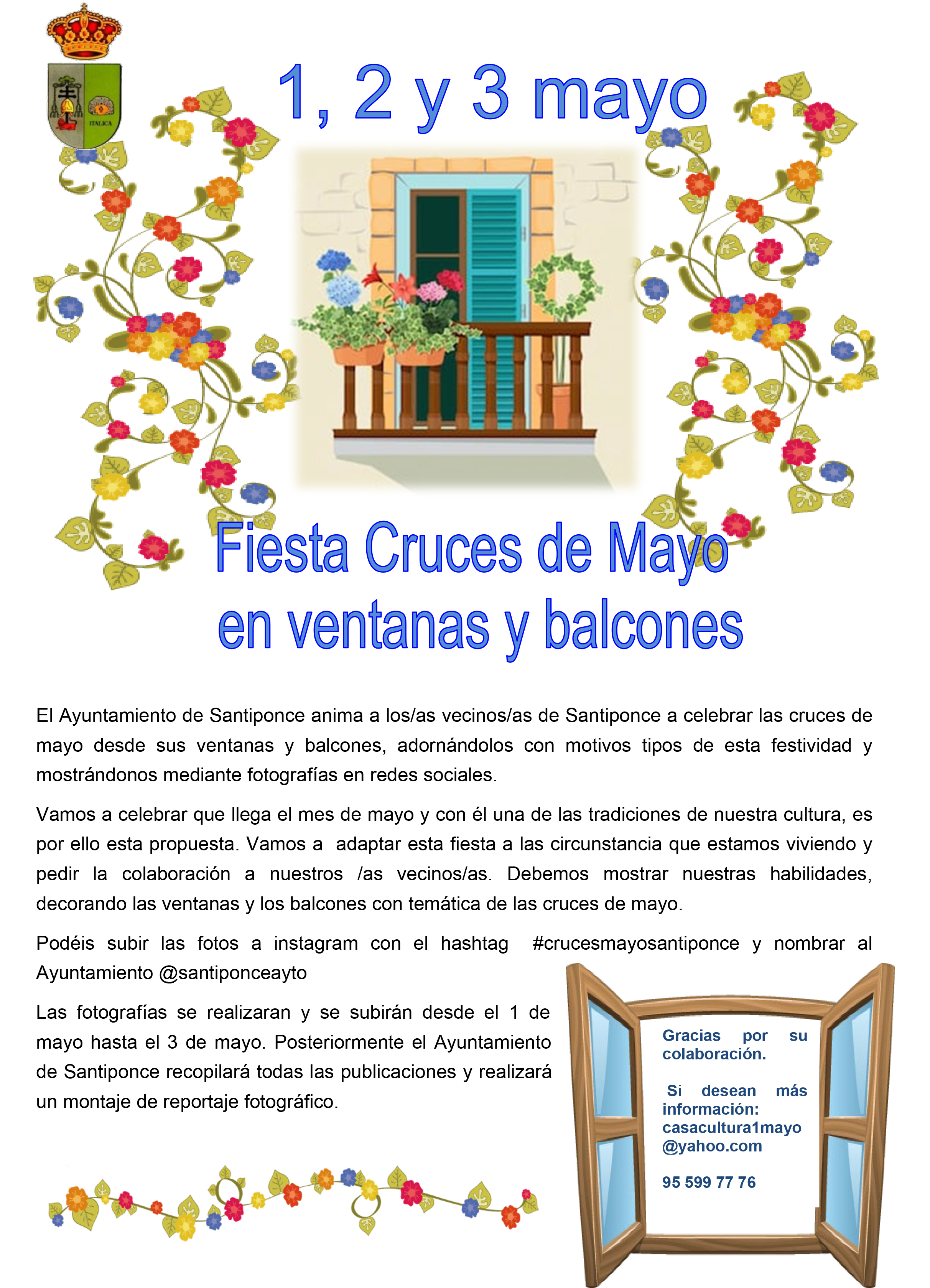 Vamos a celebrar que llega el mes de mayo y con él una de las tradiciones de nuestra cultura, es por ello esta propuesta. Vamos a adaptar esta fiesta a las circunstancia que estamos viviendo y pedir la colaboración a nuestros /as vecinos/as. Debemos mostrar nuestras habilidades, decorando las ventanas y los balcones con temática de las cruces de mayo.