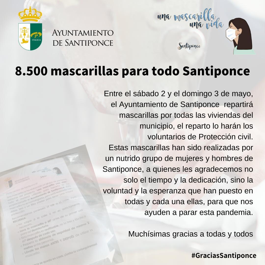 Entre el sábado 2 y el domingo 3 de mayo, el Ayuntamiento de Santiponce repartirá mascarillas por todas las viviendas del municipio, el reparto lo harán los voluntarios de Protección civil.