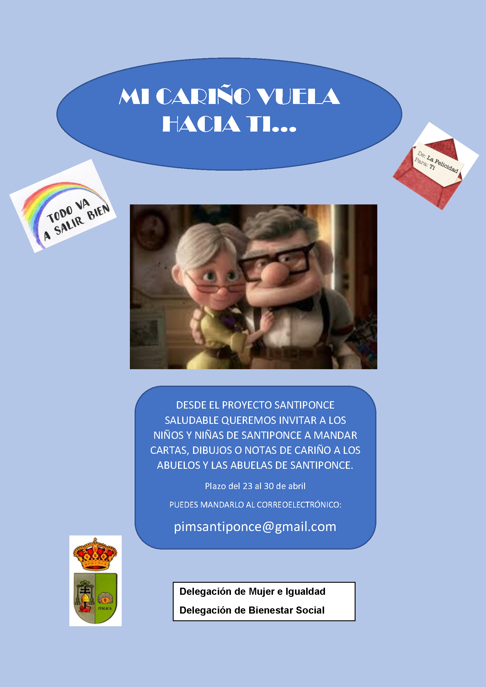 El pasado 23 de abril se lanzó a través de las redes sociales del Ayuntamiento de Santiponce la iniciativa "MI CARIÑO VUELA HACIA TI…" para invitar a nuestros niños y nuestras niñas a mandar dibujos, notas o cartas a las personas mayores de nuestro municipio.